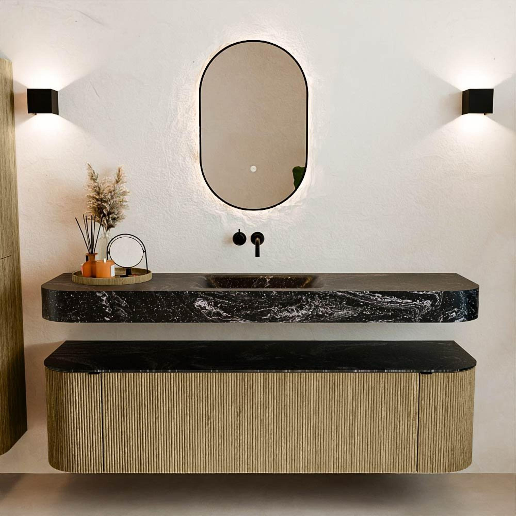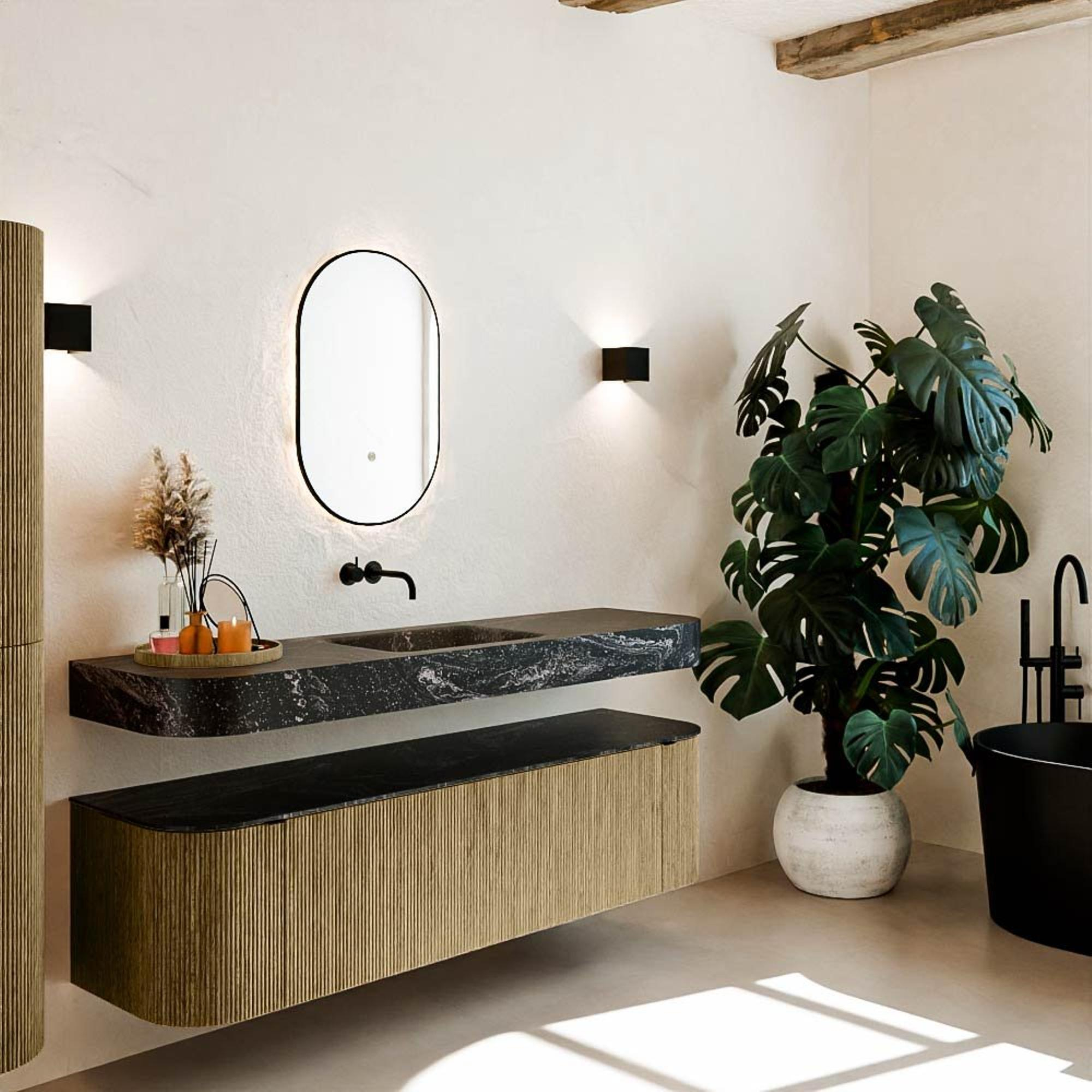 Matériaux naturels dans des tons chauds. Les nervures verticales apportent rythme et texture au design, tandis que le chêne confère une apparence chaleureuse et artisanale. Choisissez parmi 5 teintes de bois OAK, WALNUT, DUSK, SHADOW et RUBY, des couleurs de bois soigneusement sélectionnées pour enrichir les salles de bains modernes et classiques.