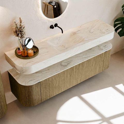 Au-dessus du meuble flotte une vasque suspendue assortie aux coins arrondis – parfaitement adaptée à la forme du meuble. La vasque est en Solid Surface et suit subtilement les lignes du meuble inférieur, créant un ensemble harmonieux. Le plan de travail en Solid Surface constitue une base solide et facile d'entretien et complète la combinaison.