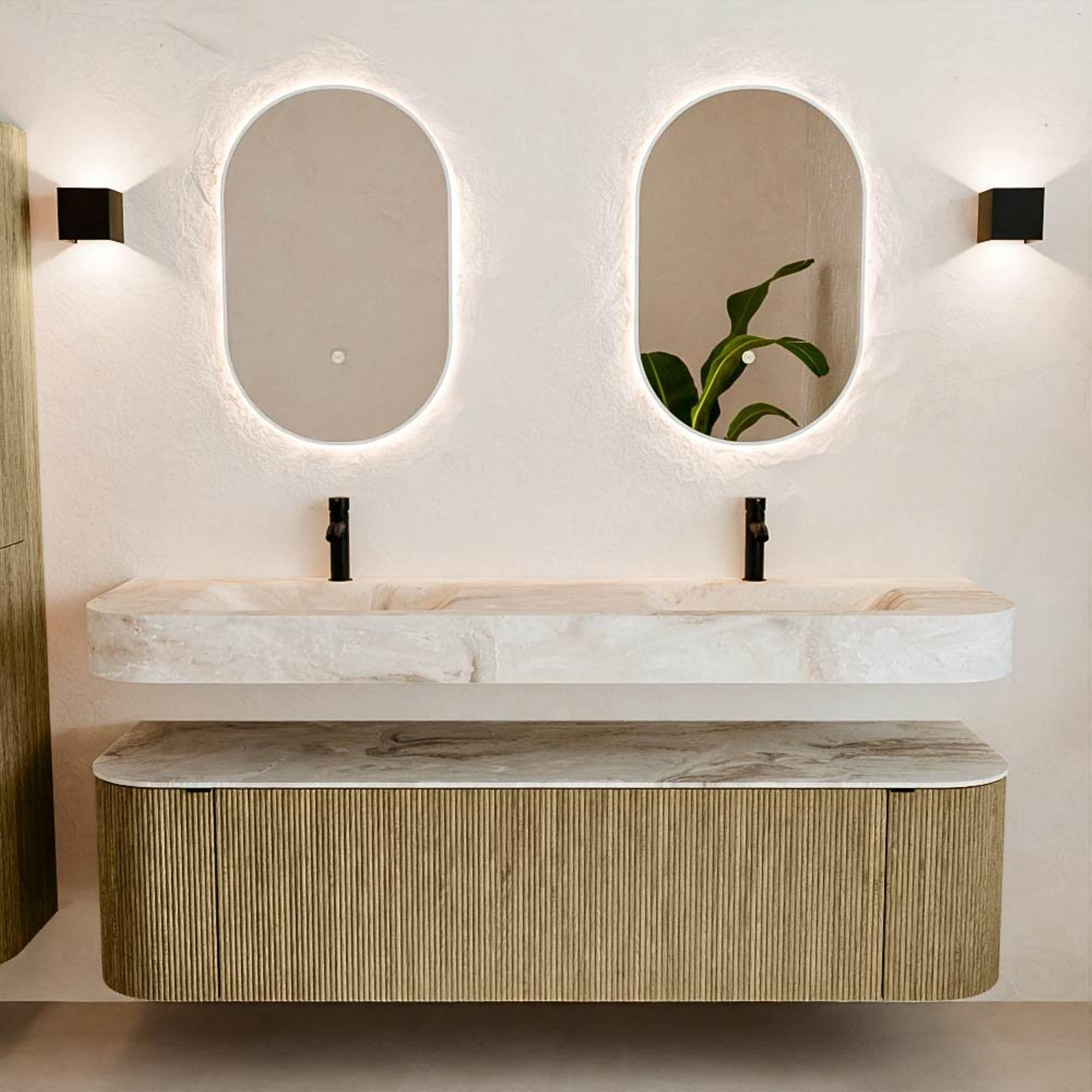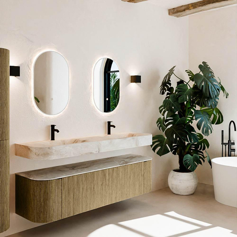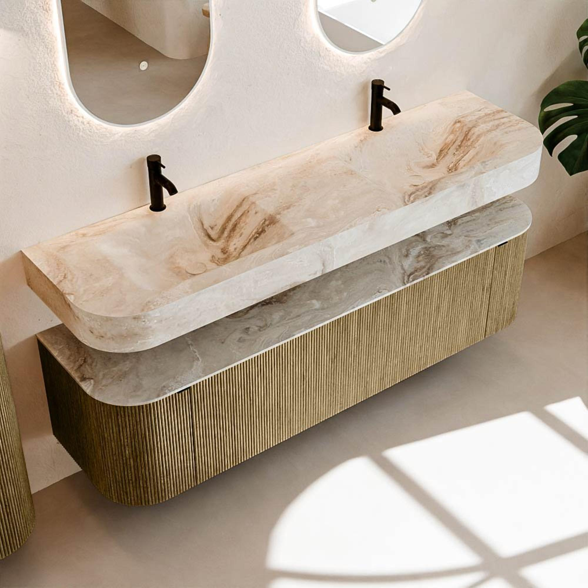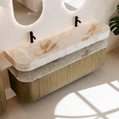 Matériaux naturels dans des tons chauds. Les nervures verticales apportent rythme et texture au design, tandis que le chêne confère une apparence chaleureuse et artisanale. Choisissez parmi 5 teintes de bois OAK, WALNUT, DUSK, SHADOW et RUBY, des couleurs de bois soigneusement sélectionnées pour enrichir les salles de bains modernes et classiques.