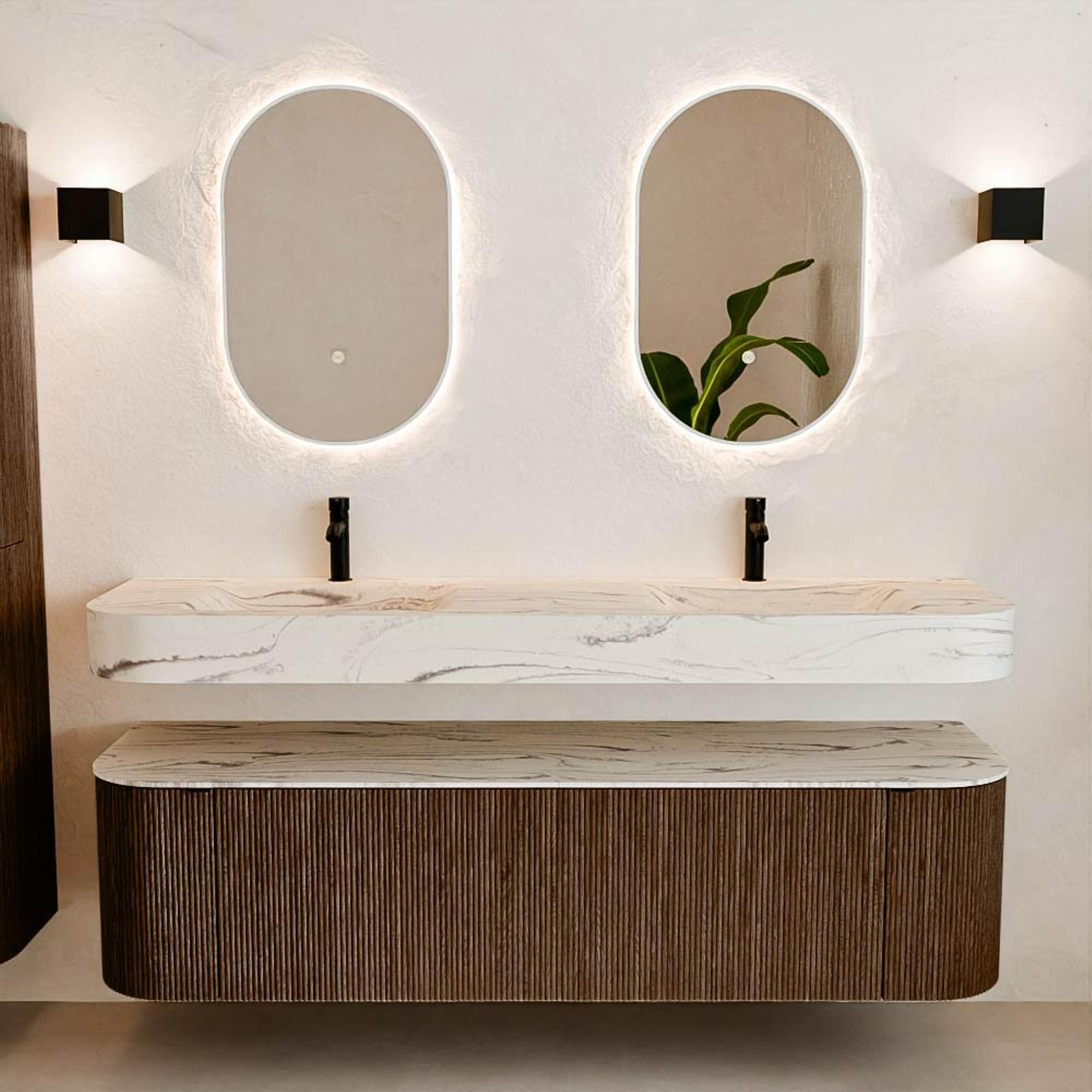 MONDIAZ THOR-DLUX Meuble de salle de bains 170cm arrondi gauche + droite couleur Walnut avec 1 tiroir et 2 portes. Vasque suspendue CLOUD Double 2 trous de robinet couleur Nata.