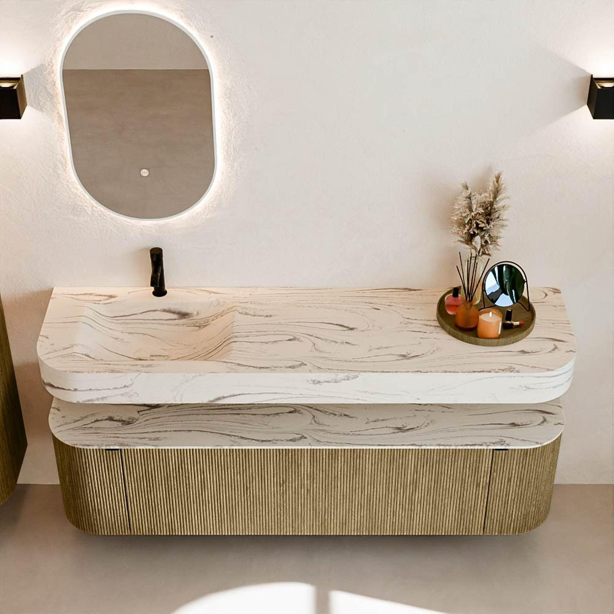 Matériaux naturels dans des tons chauds. Les cannelures verticales apportent rythme et texture au design, tandis que le chêne confère une apparence chaleureuse et artisanale. Choisissez parmi 5 teintes de bois OAK, WALNUT, DUSK, SHADOW et RUBY, des couleurs de bois soigneusement sélectionnées pour enrichir les salles de bains modernes et classiques.