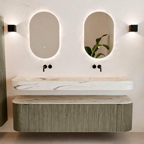 Matériaux naturels dans des tons chauds. Les nervures verticales apportent rythme et texture au design, tandis que le chêne confère une apparence chaleureuse et artisanale. Choisissez parmi 5 teintes de bois OAK, WALNUT, DUSK, SHADOW et RUBY, des couleurs de bois soigneusement sélectionnées pour enrichir les salles de bains modernes et classiques.