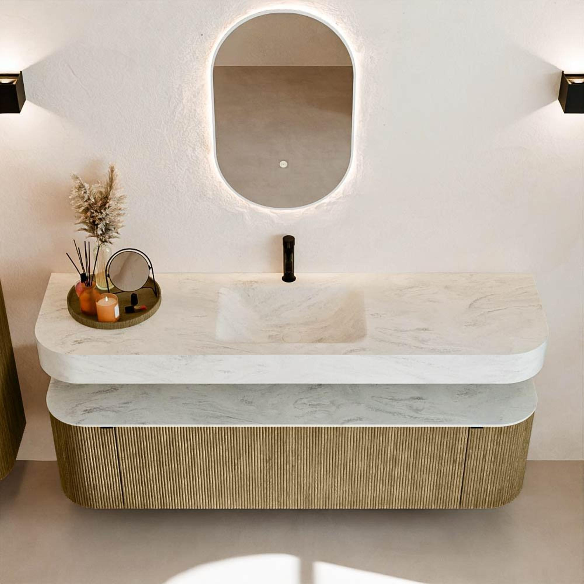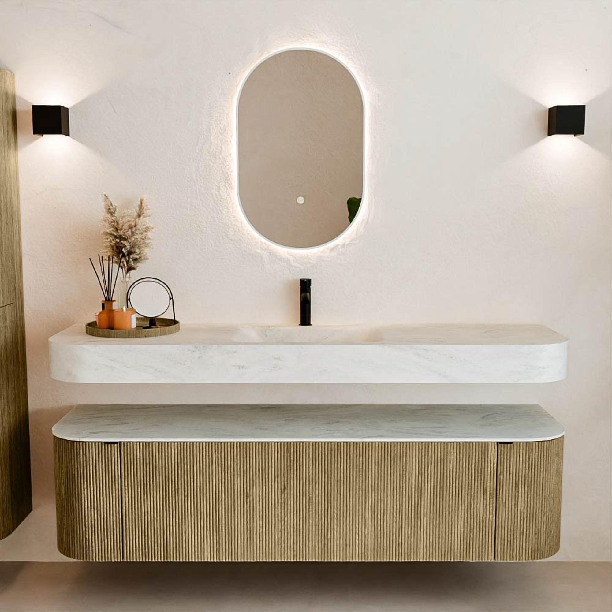 Matériaux naturels dans des tons chauds. Les nervures verticales apportent rythme et texture au design, tandis que le chêne confère une apparence chaleureuse et artisanale. Choisissez parmi 5 teintes de bois OAK, WALNUT, DUSK, SHADOW et RUBY, des couleurs de bois soigneusement sélectionnées pour enrichir les salles de bains modernes et classiques.