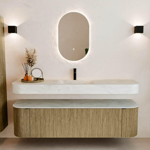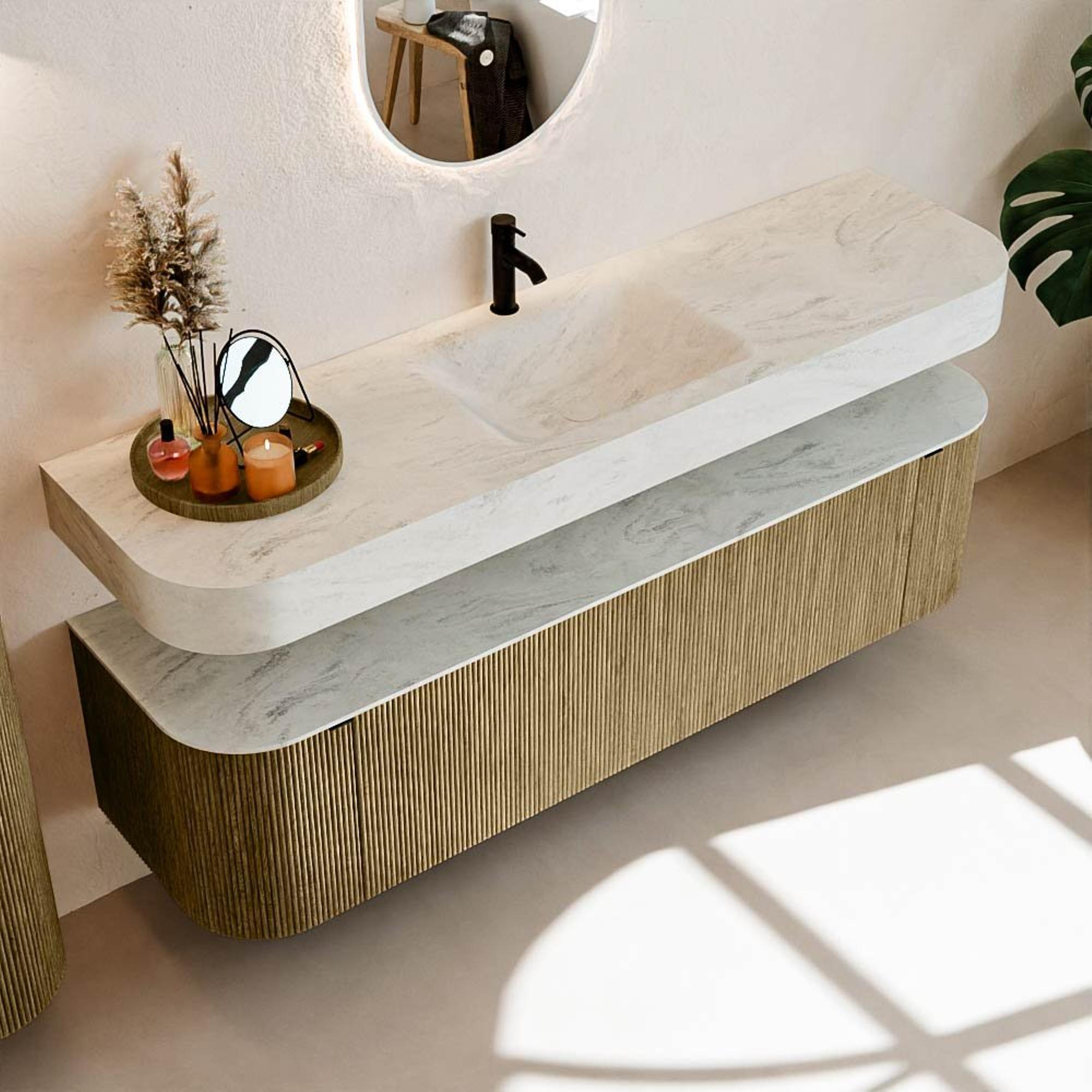 Au-dessus du meuble flotte une vasque suspendue assortie aux coins arrondis – parfaitement adaptée à la forme du meuble. La vasque est en Solid Surface et suit subtilement les lignes du meuble inférieur, créant une harmonie parfaite. Le plan de travail en Solid Surface forme une base solide et facile d'entretien et complète l'ensemble.