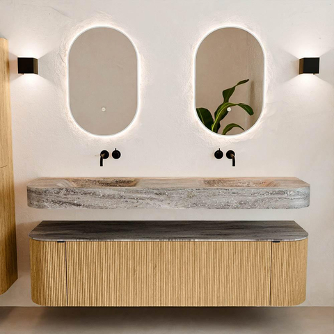 Matériaux naturels dans des tons chauds. Les cannelures verticales apportent rythme et texture au design, tandis que le chêne confère une apparence chaleureuse et artisanale. Choisissez parmi 5 teintes de bois OAK, WALNUT, DUSK, SHADOW et RUBY, des couleurs de bois soigneusement sélectionnées pour enrichir les salles de bains modernes et classiques.