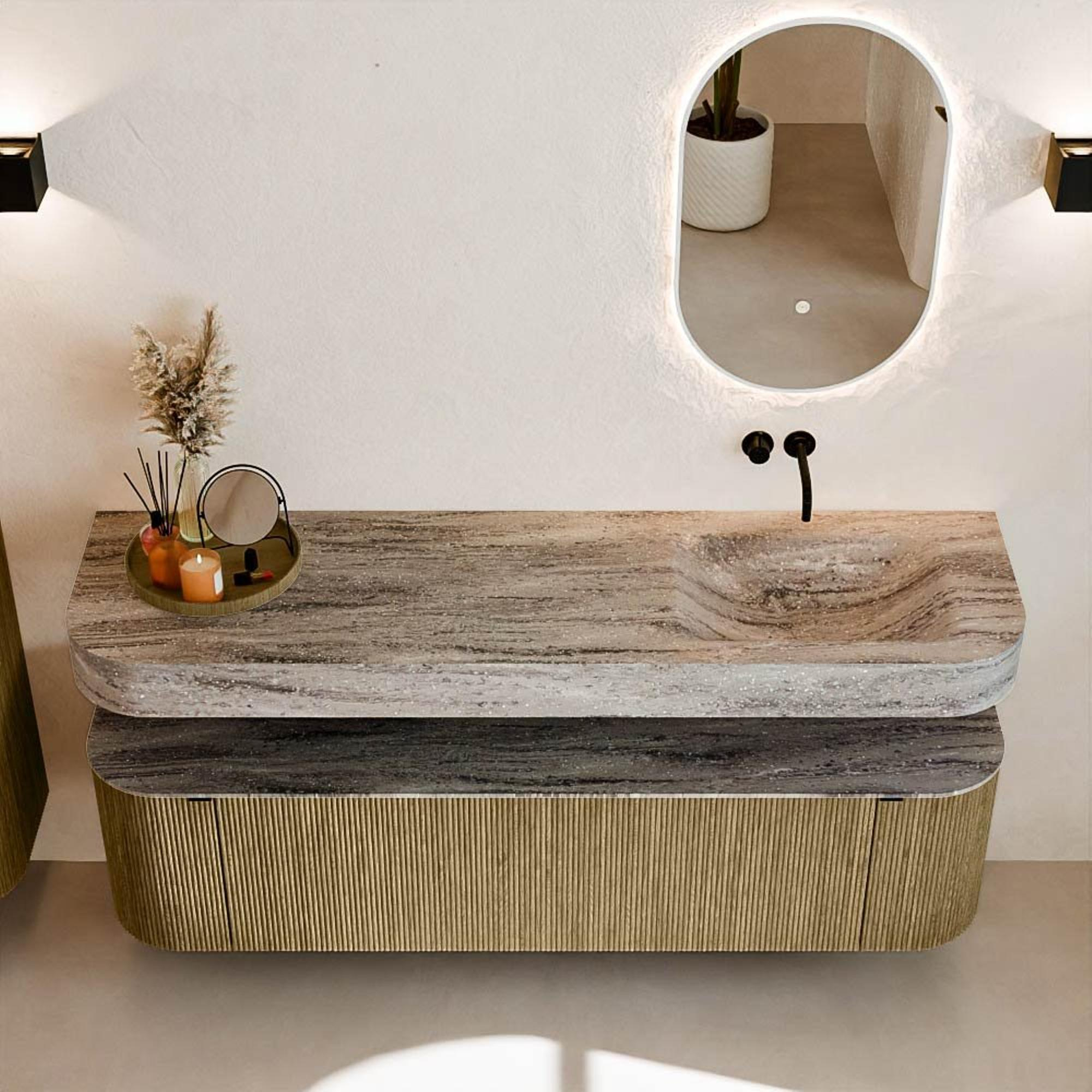 Matériaux naturels dans des tons chauds. Les nervures verticales apportent rythme et texture au design, tandis que le chêne confère une apparence chaleureuse et artisanale. Choisissez parmi 5 teintes de bois OAK, WALNUT, DUSK, SHADOW et RUBY, des couleurs de bois soigneusement sélectionnées pour enrichir les salles de bains modernes et classiques.