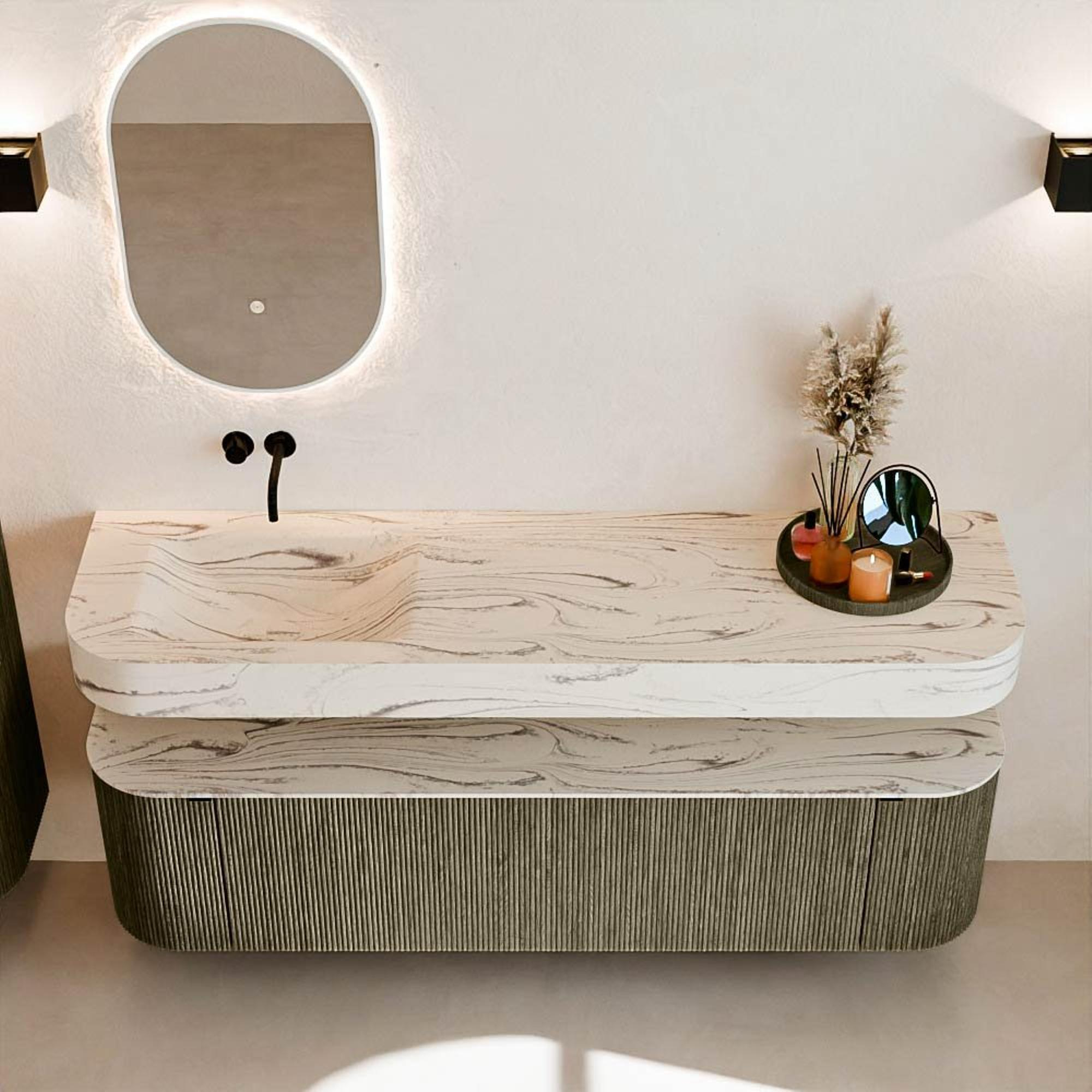 Au-dessus du meuble flotte une vasque suspendue assortie aux coins arrondis – parfaitement adaptée à la forme du meuble. La vasque est réalisée en Solid Surface et suit subtilement les lignes du meuble inférieur, créant ainsi un ensemble harmonieux. Le plan de travail en Solid Surface constitue une base solide et facile d'entretien et complète la combinaison.