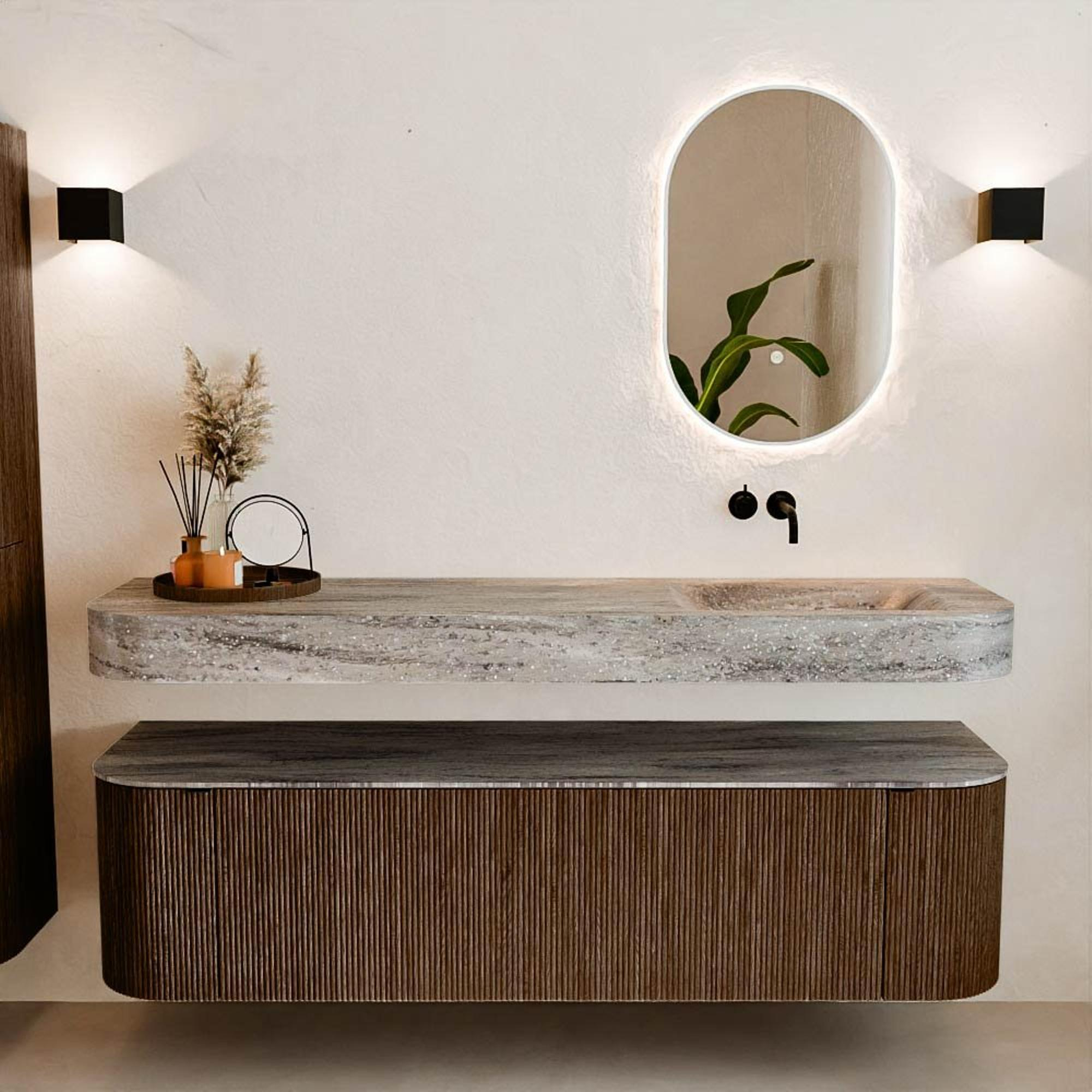 Matériaux naturels dans des tons chauds. Les nervures verticales apportent rythme et texture au design, tandis que le chêne confère une apparence chaleureuse et artisanale. Choisissez parmi 5 teintes de bois OAK, WALNUT, DUSK, SHADOW et RUBY, des couleurs de bois soigneusement sélectionnées pour enrichir les salles de bains modernes et classiques.
