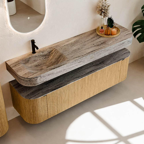Matériaux naturels aux teintes chaudes. Les nervures verticales apportent rythme et texture au design, tandis que le chêne confère une apparence chaleureuse et artisanale. Choisissez parmi 5 teintes de bois OAK, WALNUT, DUSK, SHADOW et RUBY, des couleurs de bois soigneusement sélectionnées pour enrichir les salles de bains modernes et classiques.