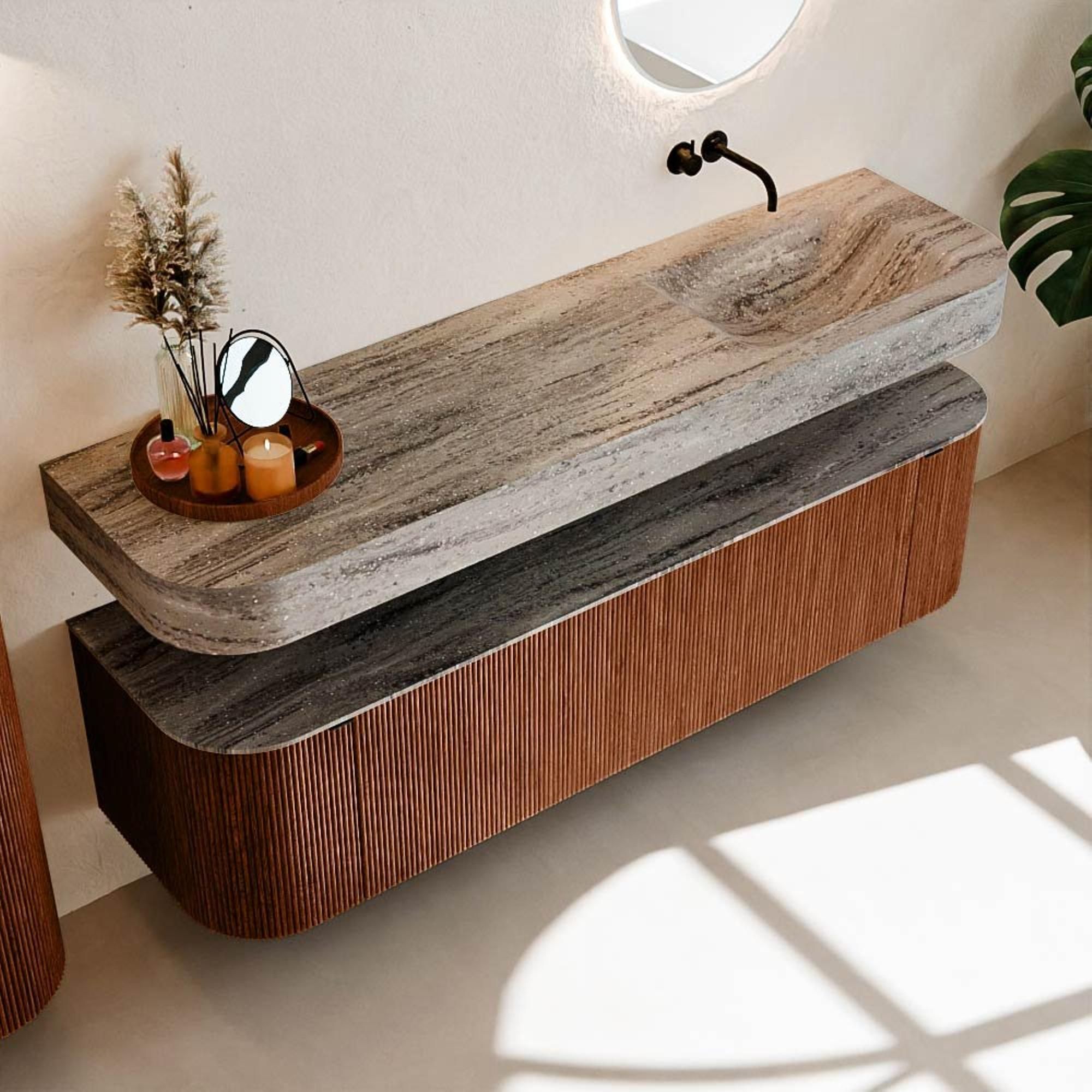 Matériaux naturels aux teintes chaudes. Les nervures verticales apportent rythme et texture au design, tandis que le chêne confère une apparence chaleureuse et artisanale. Choisissez parmi 5 teintes de bois OAK, WALNUT, DUSK, SHADOW et RUBY, des couleurs de bois soigneusement sélectionnées pour enrichir les salles de bains modernes et classiques.
