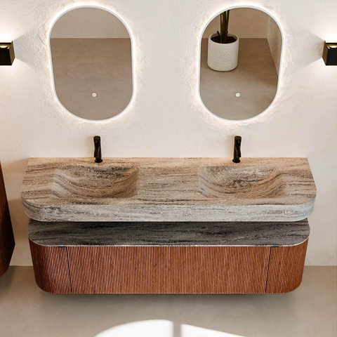 Matériaux naturels dans des tons chauds. Les nervures verticales apportent rythme et texture au design, tandis que le chêne confère une apparence chaleureuse et artisanale. Choisissez parmi 5 teintes de bois OAK, WALNUT, DUSK, SHADOW et RUBY, des couleurs de bois soigneusement sélectionnées pour enrichir les salles de bains modernes et classiques.