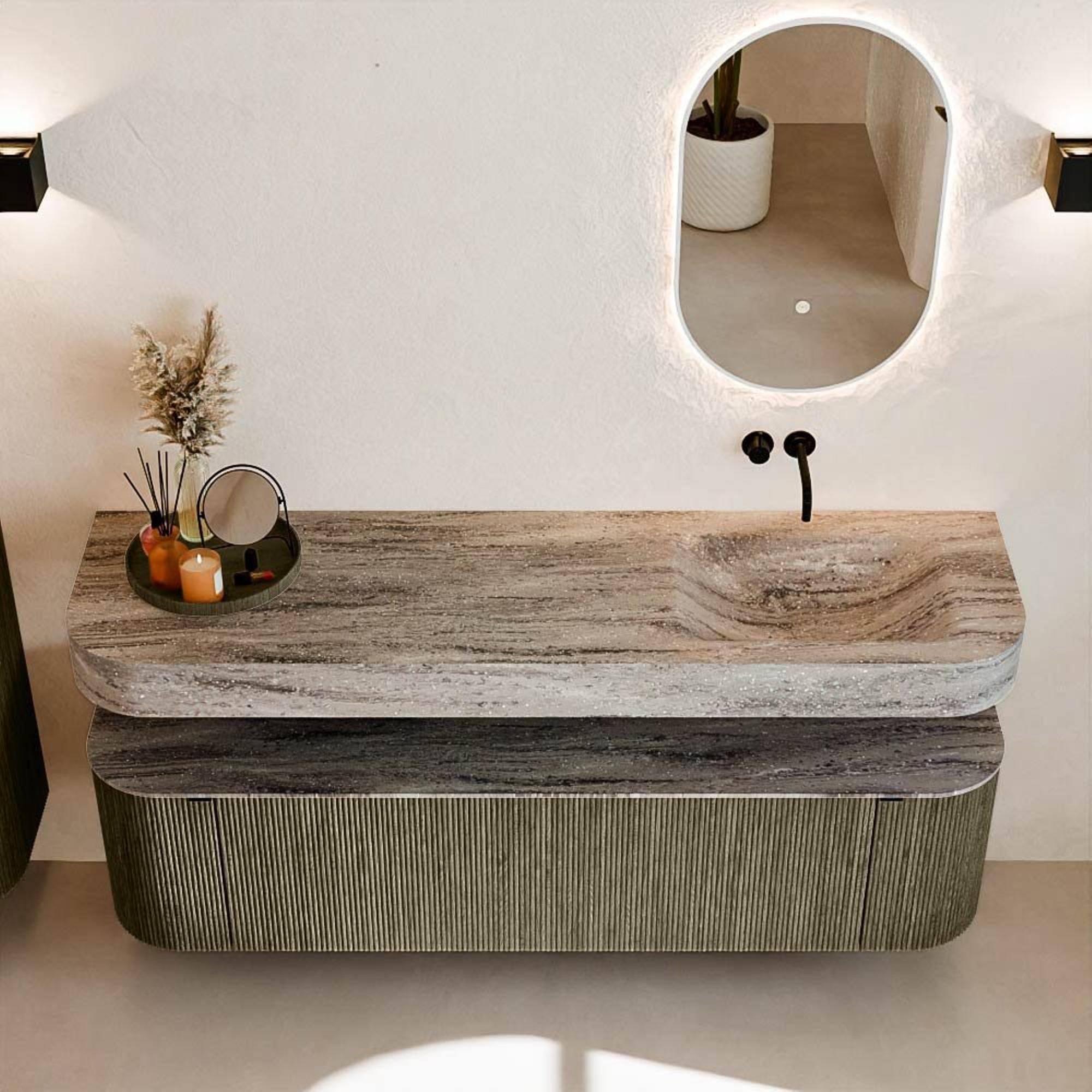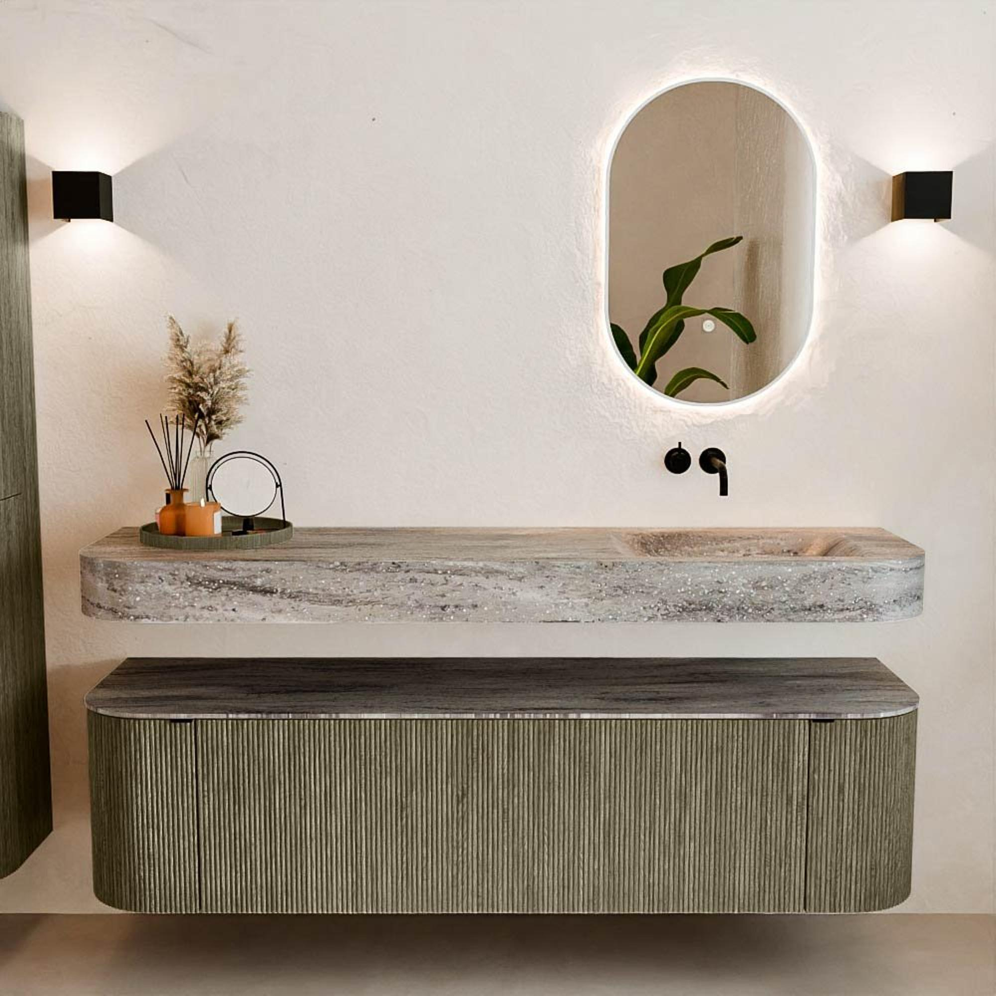 Matériaux naturels dans des tons chauds. Les nervures verticales apportent rythme et texture au design, tandis que le chêne confère une apparence chaleureuse et artisanale. Choisissez parmi 5 teintes de bois OAK, WALNUT, DUSK, SHADOW et RUBY, des couleurs de bois soigneusement sélectionnées pour enrichir les salles de bains modernes et classiques.