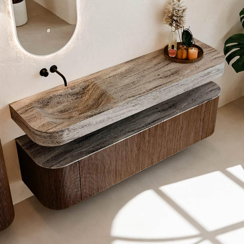 Matériaux naturels dans des tons chauds. Les nervures verticales apportent rythme et texture au design, tandis que le chêne confère une apparence chaleureuse et artisanale. Choisissez parmi 5 teintes de bois OAK, WALNUT, DUSK, SHADOW et RUBY, des couleurs de bois soigneusement sélectionnées pour enrichir les salles de bains modernes et classiques.
