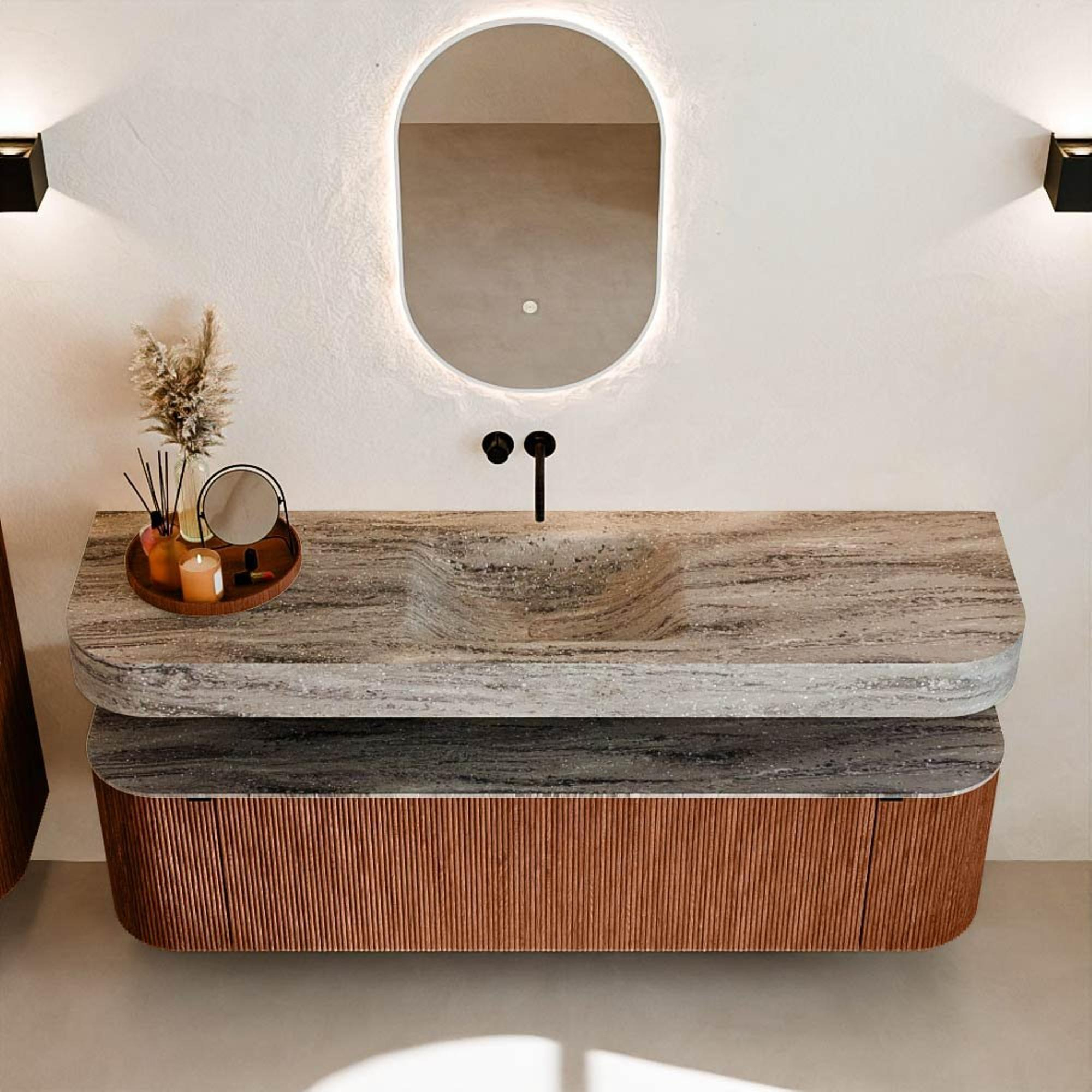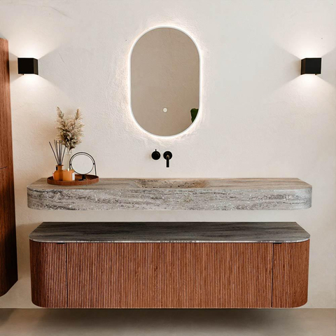 Matériaux naturels dans des tons chauds. Les nervures verticales apportent rythme et texture au design, tandis que le chêne confère une apparence chaleureuse et artisanale. Choisissez parmi 5 teintes de bois OAK, WALNUT, DUSK, SHADOW et RUBY, des couleurs de bois soigneusement sélectionnées pour enrichir les salles de bains modernes et classiques.