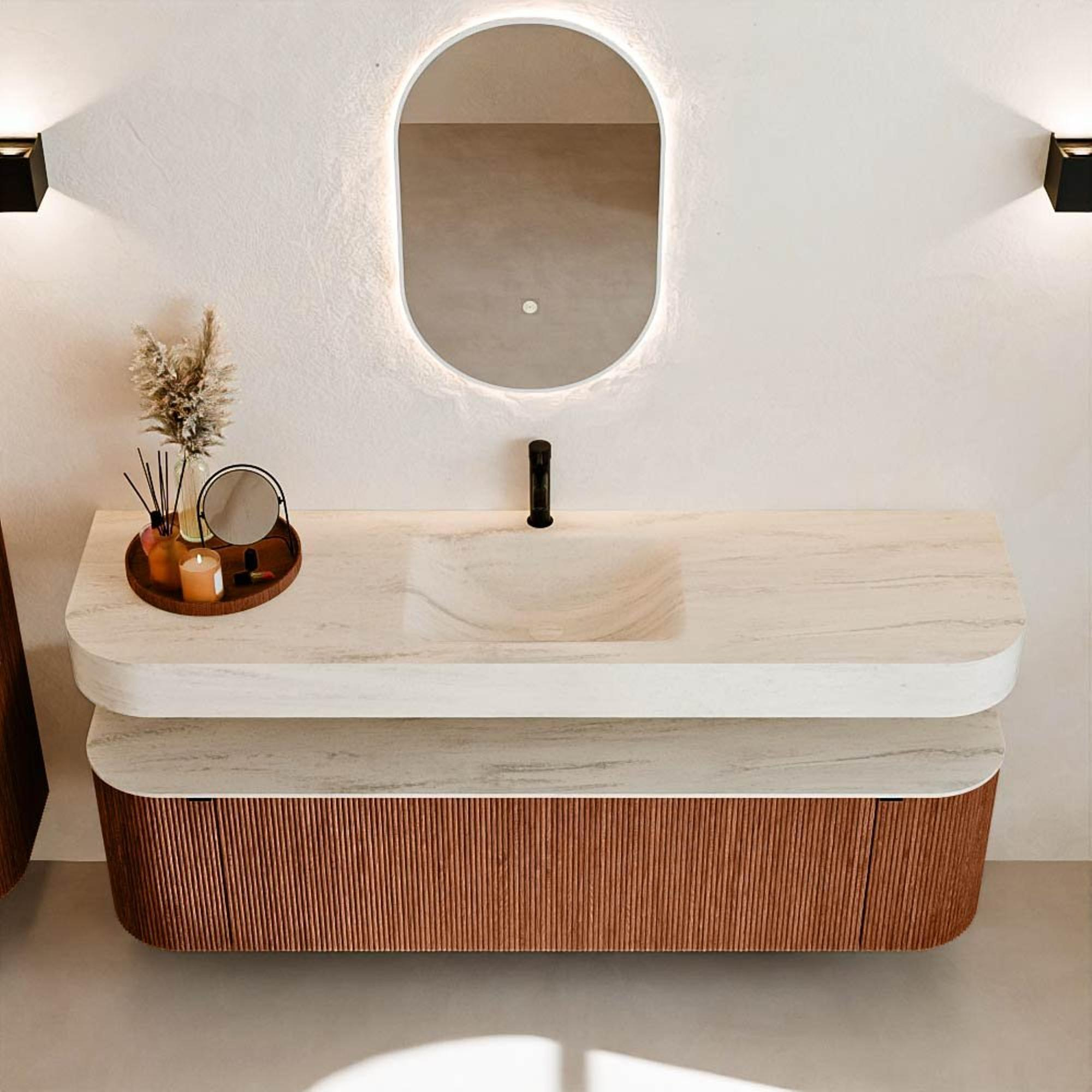 Au-dessus du meuble flotte une vasque suspendue assortie aux coins arrondis – parfaitement adaptée à la forme du meuble. La vasque est réalisée en Solid Surface et suit subtilement les lignes du meuble inférieur, créant ainsi un ensemble harmonieux. Le plan de travail en Solid Surface forme une base solide, facile d'entretien, et complète la combinaison.