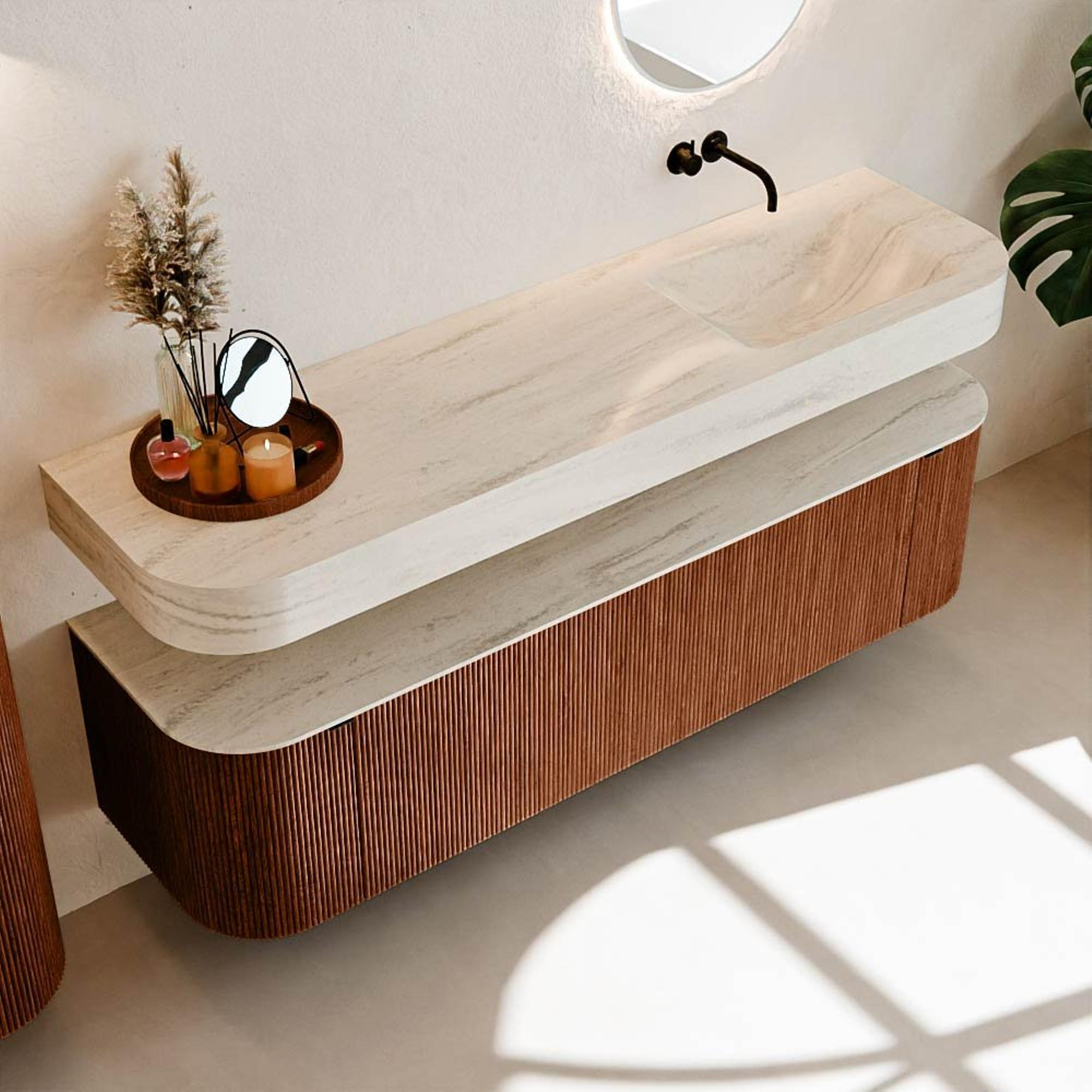 Au-dessus du meuble flotte une vasque suspendue assortie aux coins arrondis – parfaitement adaptée à la forme du meuble. La vasque est réalisée en Solid Surface et suit subtilement les lignes du meuble inférieur, créant ainsi un ensemble harmonieux. Le plan de travail en Solid Surface forme une base solide et facile d’entretien et complète la combinaison.