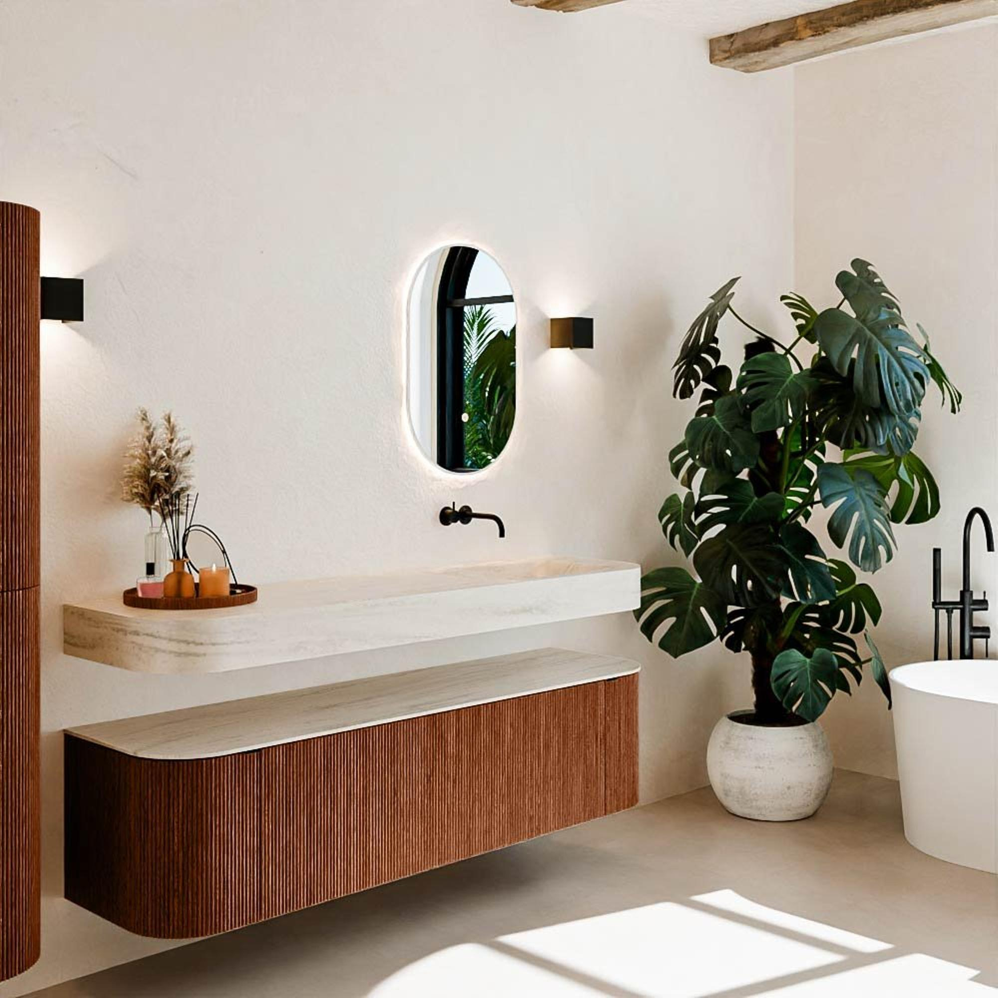 Matériaux naturels dans des tons chauds. Les nervures verticales apportent rythme et texture au design, tandis que le chêne confère une apparence chaleureuse et artisanale. Choisissez parmi 5 teintes de bois OAK, WALNUT, DUSK, SHADOW et RUBY, des couleurs de bois soigneusement sélectionnées pour enrichir les salles de bains modernes et classiques.