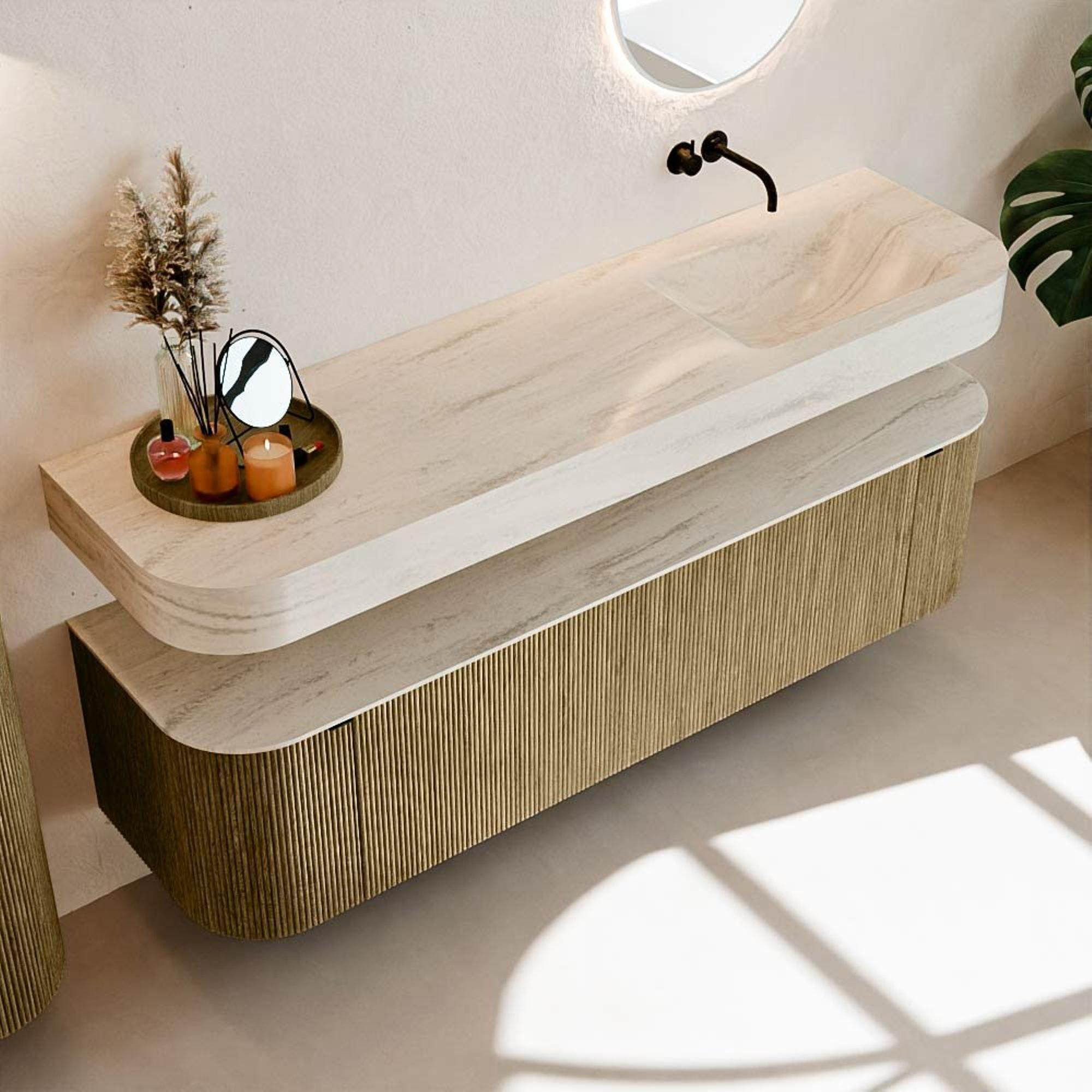 Au-dessus du meuble flotte une vasque suspendue assortie avec des coins arrondis – parfaitement adaptée à la forme du meuble. La vasque est réalisée en Solid Surface et suit subtilement les lignes du meuble inférieur, créant ainsi un ensemble harmonieux. Le plan de travail en Solid Surface forme une base solide et facile d'entretien et complète la combinaison.