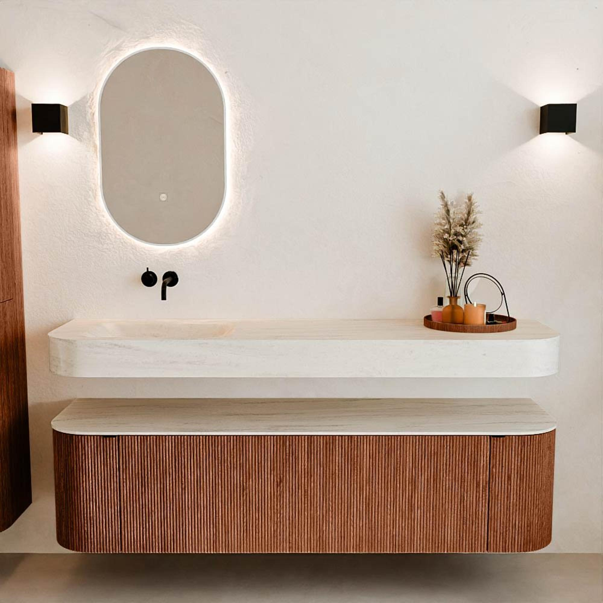 Matériaux naturels dans des tons chauds. Les nervures verticales apportent rythme et texture au design, tandis que le chêne confère une apparence chaleureuse et artisanale. Choisissez parmi 5 teintes de bois OAK, WALNUT, DUSK, SHADOW et RUBY, des couleurs de bois soigneusement sélectionnées pour enrichir les salles de bains modernes et classiques.
