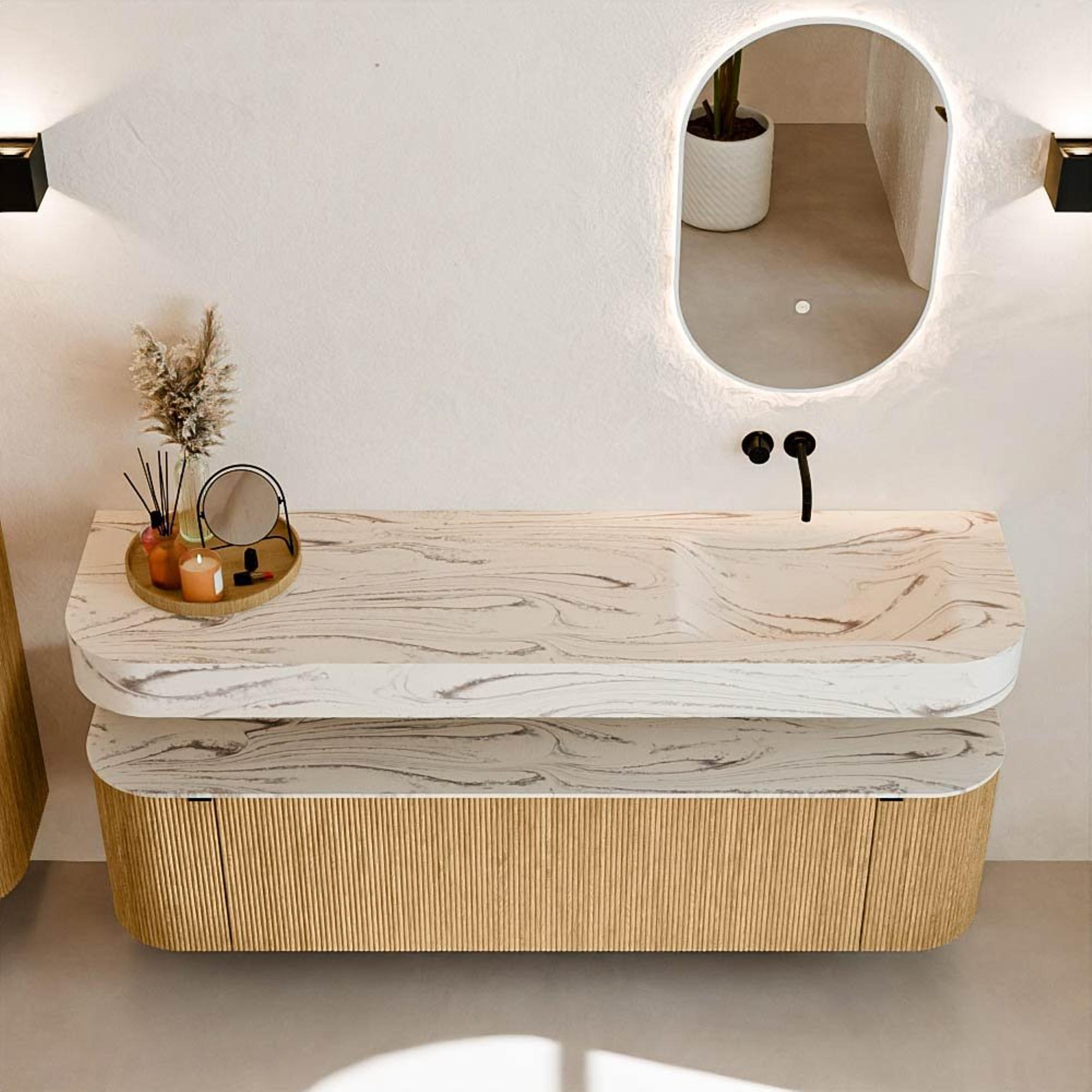 Matériaux naturels dans des tons chauds. Les cannelures verticales apportent rythme et texture au design, tandis que le chêne confère une apparence chaleureuse et artisanale. Choisissez parmi 5 teintes de bois OAK, WALNUT, DUSK, SHADOW et RUBY, des couleurs de bois soigneusement sélectionnées pour enrichir les salles de bains modernes et classiques.