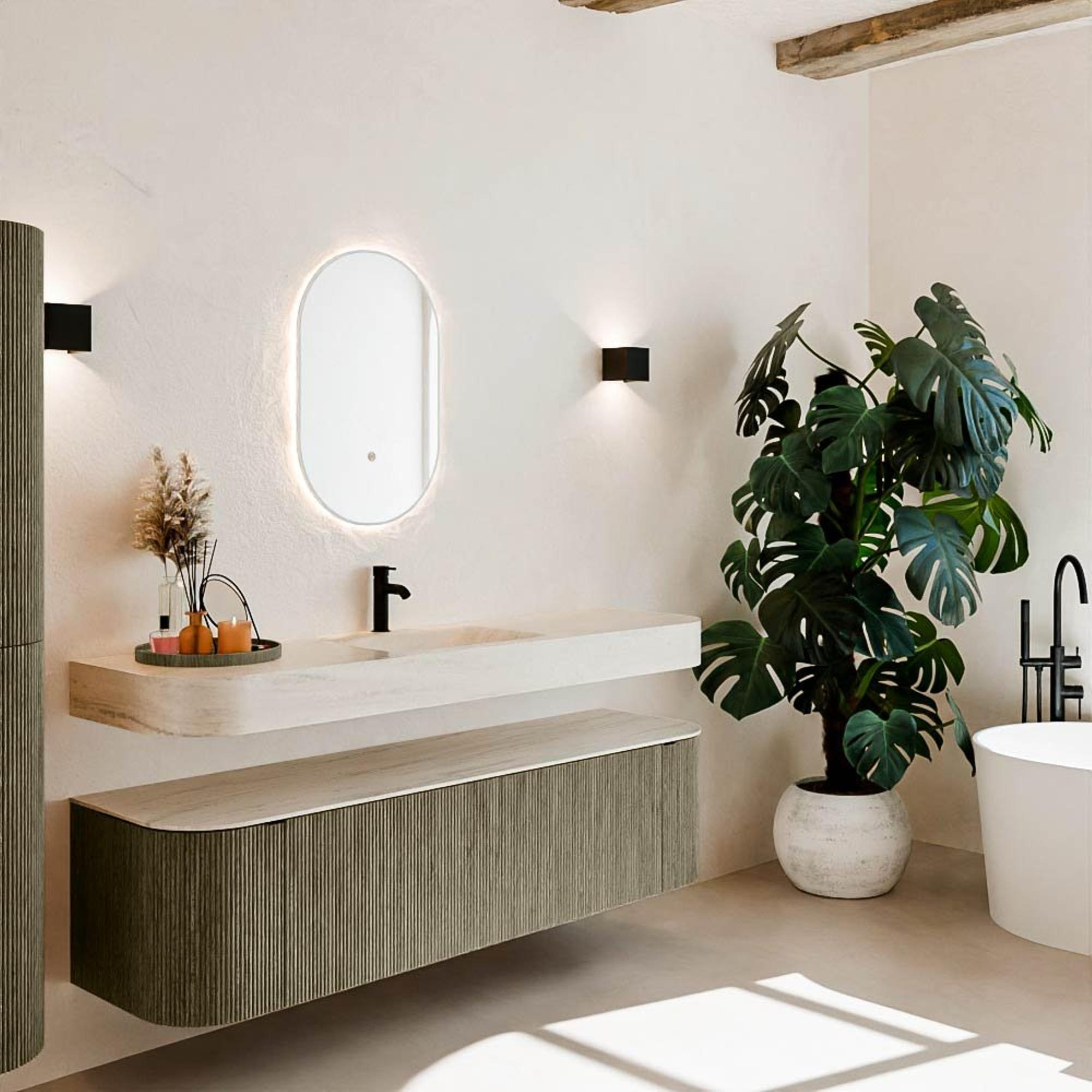 Matériaux naturels dans des tons chauds. Les nervures verticales apportent rythme et texture au design, tandis que le chêne confère une apparence chaleureuse et artisanale. Choisissez parmi 5 teintes de bois OAK, WALNUT, DUSK, SHADOW et RUBY, des couleurs de bois soigneusement sélectionnées pour enrichir les salles de bains modernes et classiques.