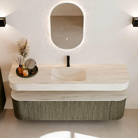Au-dessus du meuble flotte une vasque suspendue assortie aux coins arrondis – parfaitement adaptée à la forme du meuble. La vasque est réalisée en Solid Surface et suit subtilement les lignes du meuble inférieur, créant un ensemble harmonieux. Le plan de travail en Solid Surface forme une base solide et facile d'entretien et complète la combinaison.