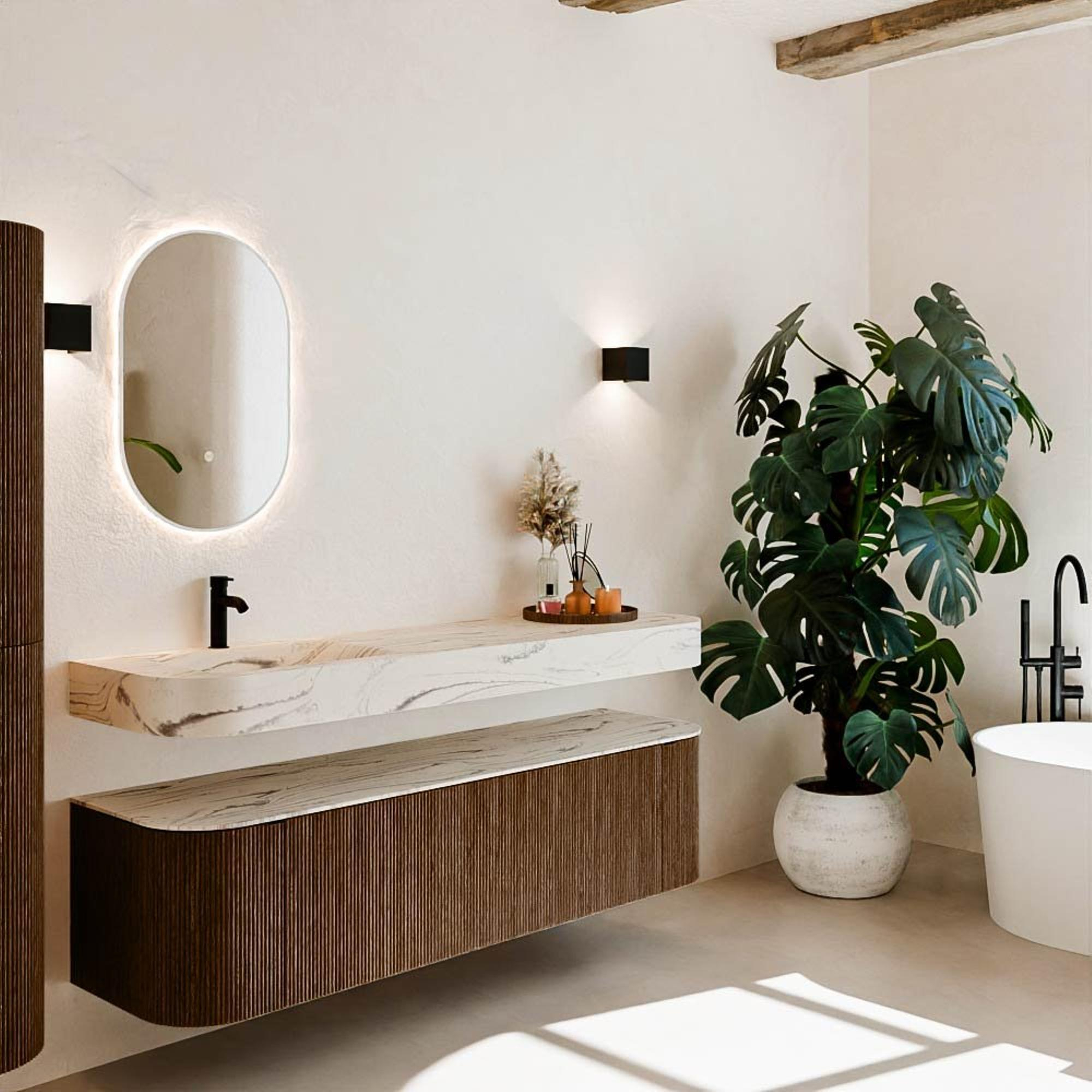 Matériaux naturels dans des tons chauds. Les nervures verticales apportent rythme et texture au design, tandis que le chêne confère une apparence chaleureuse et artisanale. Choisissez parmi 5 teintes de bois OAK, WALNUT, DUSK, SHADOW et RUBY, des couleurs de bois soigneusement sélectionnées pour enrichir les salles de bains modernes et classiques.