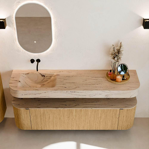 Au-dessus du meuble flotte une vasque suspendue assortie aux coins arrondis – parfaitement adaptée à la forme du meuble. La vasque est réalisée en Solid Surface et suit subtilement les lignes du meuble inférieur, créant ainsi un ensemble harmonieux. Le plan de travail en Solid Surface forme une base solide et facile d'entretien, complétant la combinaison.