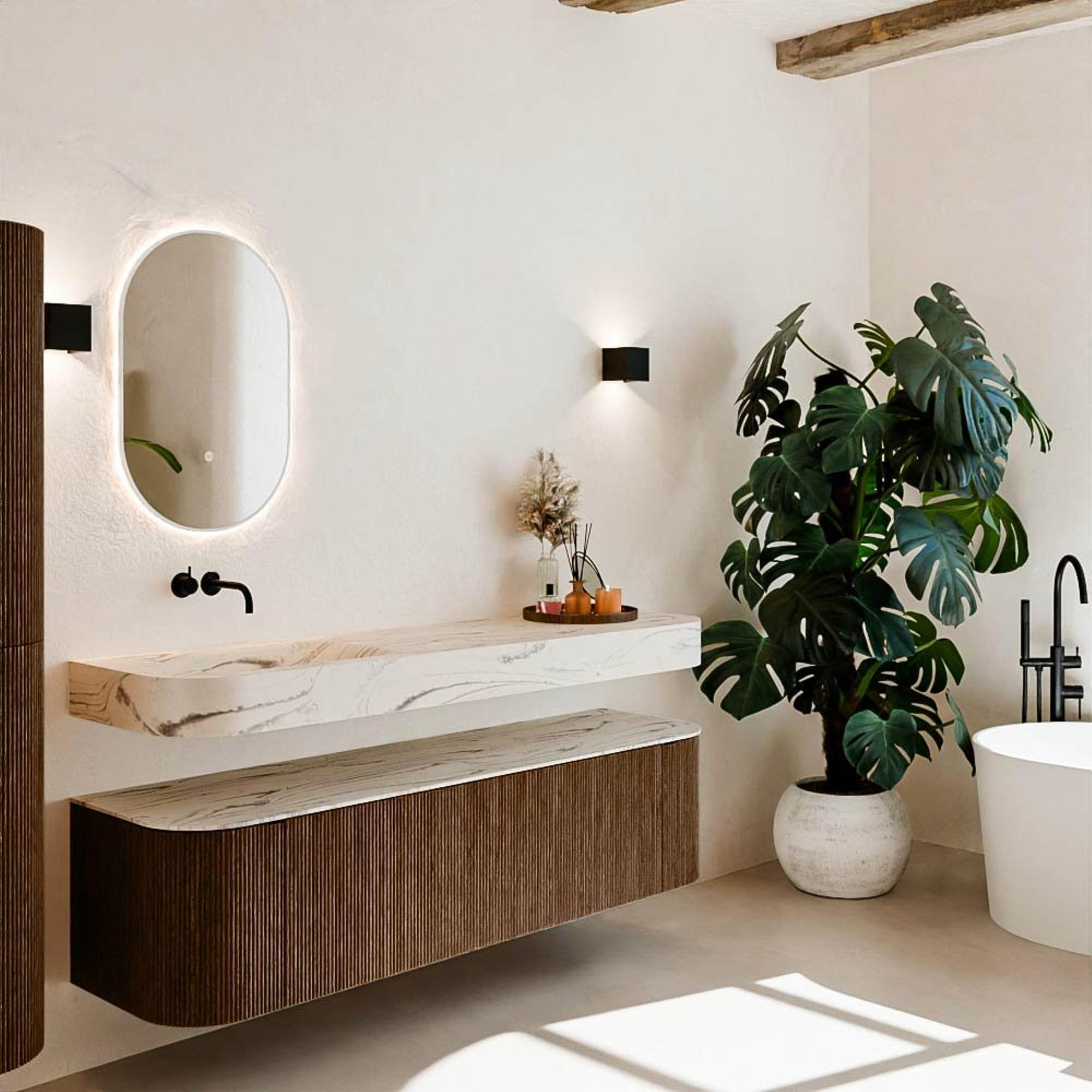 Matériaux naturels dans des tons chauds. Les nervures verticales apportent rythme et texture au design, tandis que le chêne confère une apparence chaleureuse et artisanale. Choisissez parmi 5 teintes de bois OAK, WALNUT, DUSK, SHADOW et RUBY, des couleurs de bois soigneusement sélectionnées pour enrichir les salles de bains modernes et classiques.