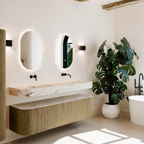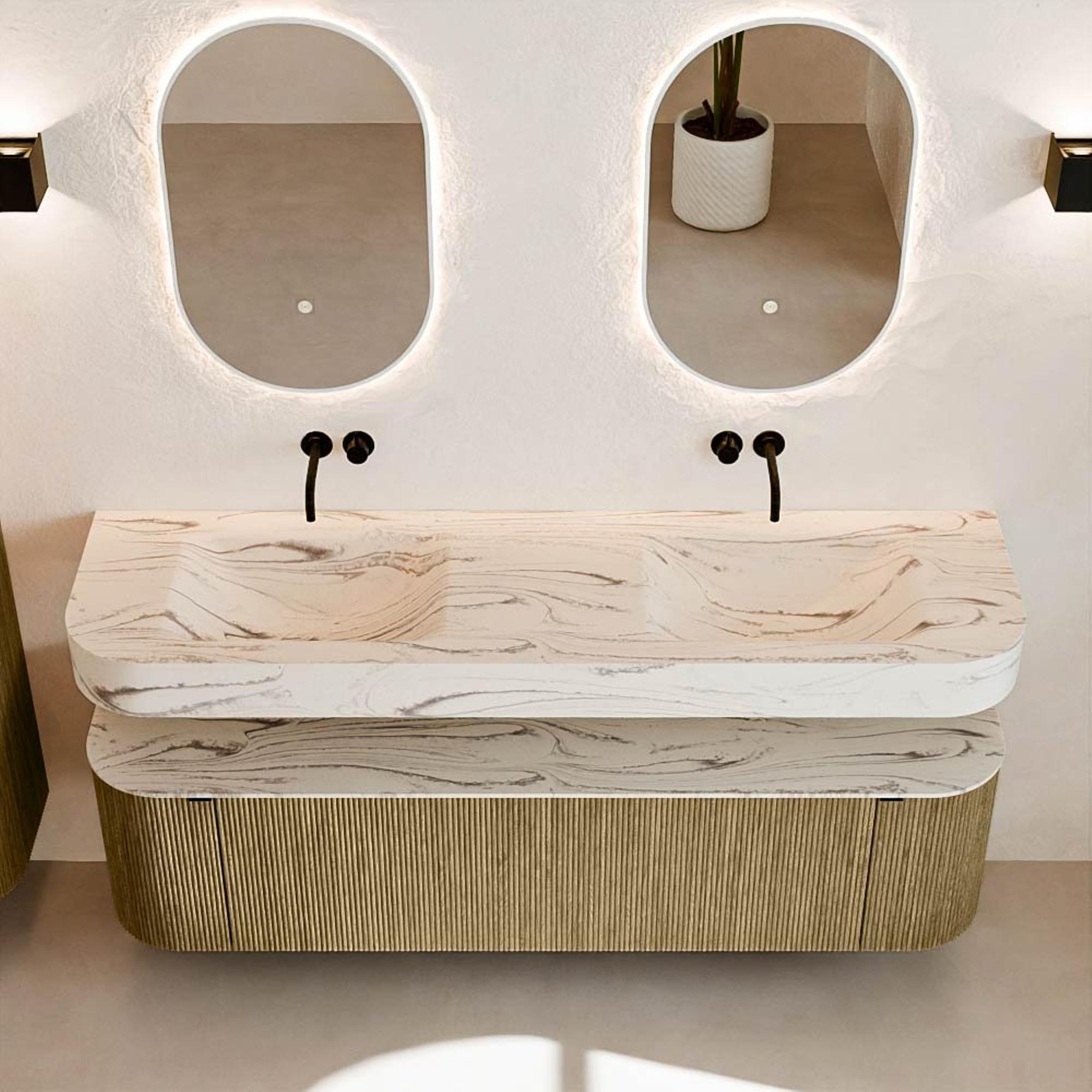 Matériaux naturels dans des tons chauds. Les nervures verticales apportent rythme et texture au design, tandis que le chêne confère une apparence chaleureuse et artisanale. Choisissez parmi 5 teintes de bois OAK, WALNUT, DUSK, SHADOW et RUBY, des couleurs de bois soigneusement sélectionnées pour enrichir les salles de bains modernes et classiques.