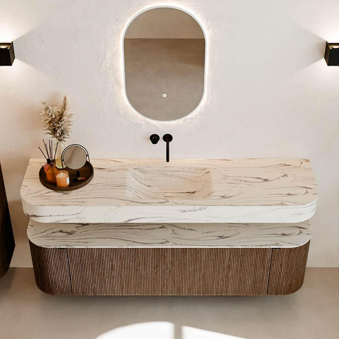 Au-dessus du meuble flotte une vasque suspendue assortie aux coins arrondis – parfaitement adaptée à la forme du meuble. La vasque est réalisée en Solid Surface et suit subtilement les lignes du meuble inférieur, créant ainsi un ensemble harmonieux. Le plan de travail en Solid Surface forme une base solide, facile d'entretien et complète la combinaison.