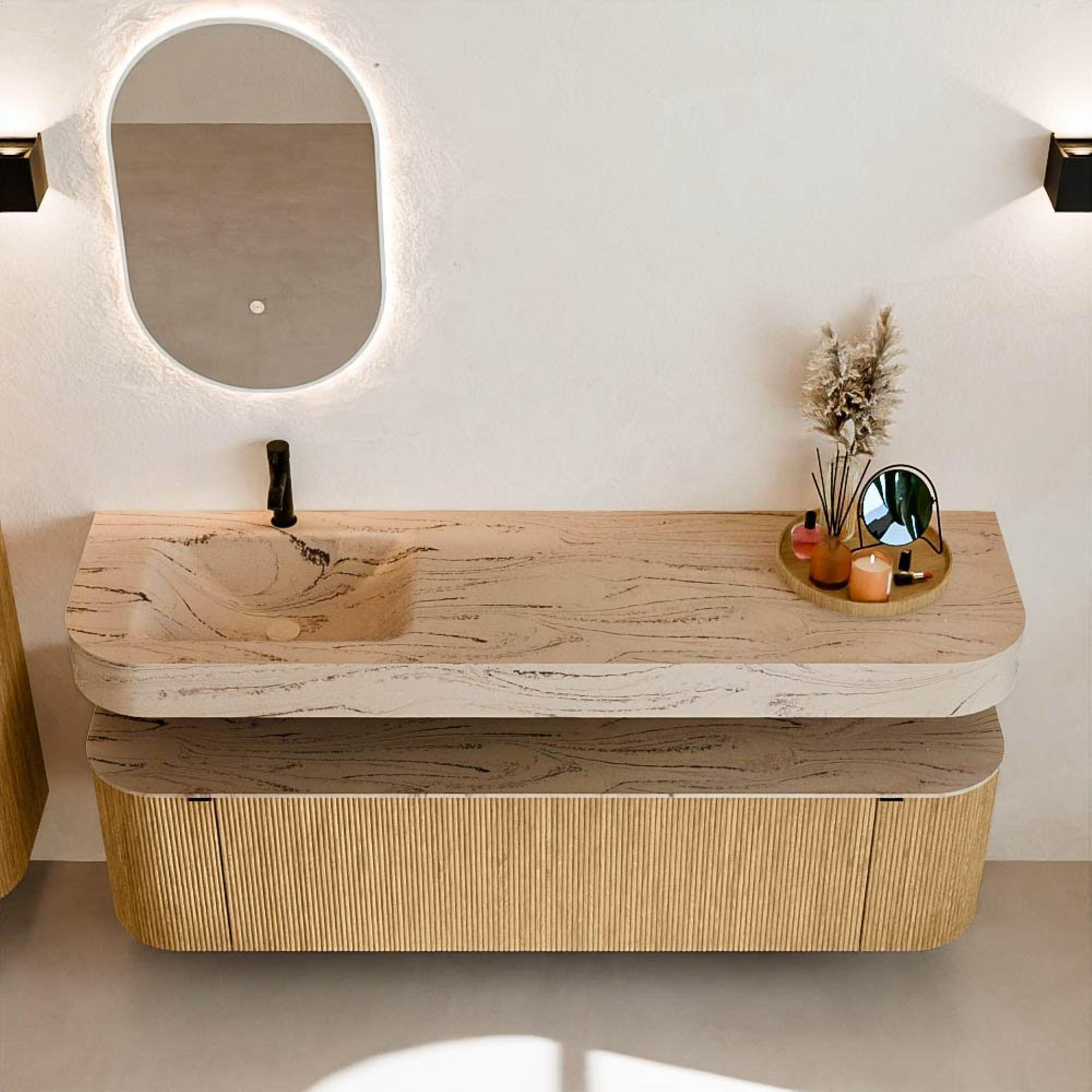 MONDIAZ THOR-DLUX 170cm meuble de salle de bains arrondi gauche + droite couleur Oak avec 1 tiroir et 2 portes. Vasque suspendue CLOUD Gauche 1 trou de robinet couleur Arena.
