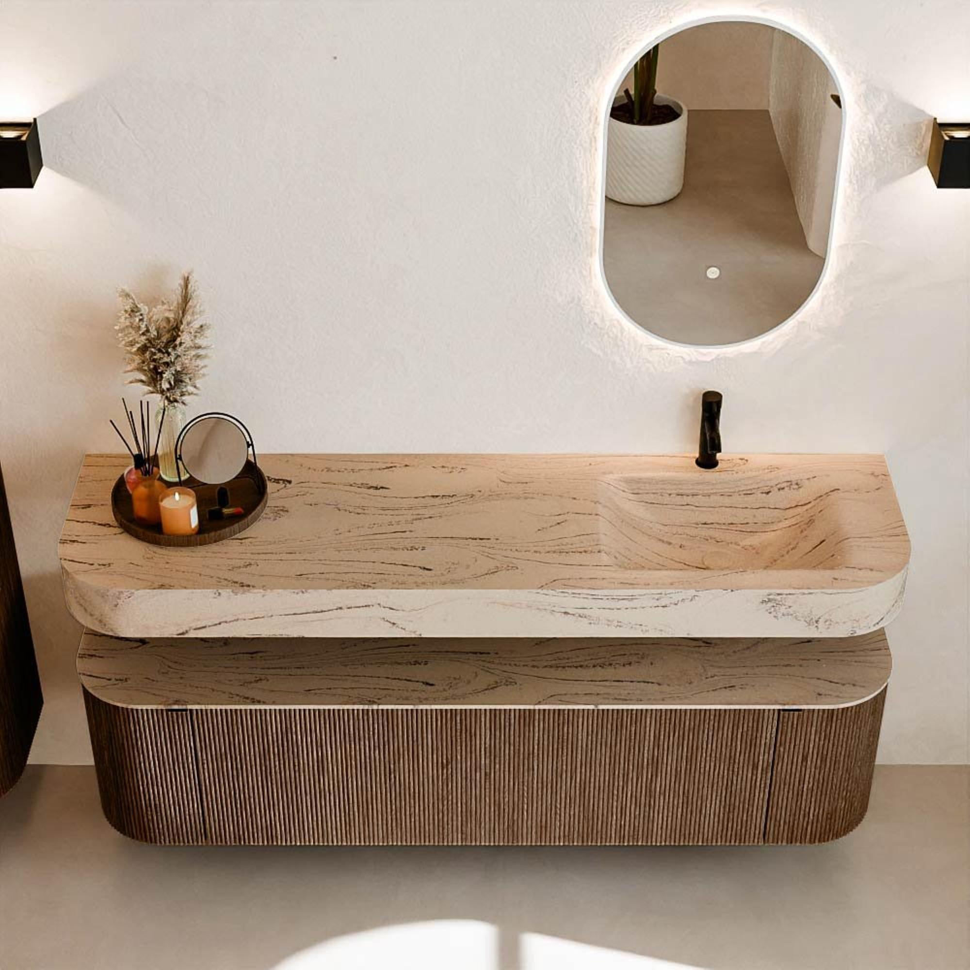 Matériaux naturels dans des tons chauds. Les cannelures verticales apportent rythme et texture au design, tandis que le chêne confère une apparence chaleureuse et artisanale. Choisissez parmi 5 teintes de bois OAK, WALNUT, DUSK, SHADOW et RUBY, des couleurs de bois soigneusement sélectionnées pour enrichir les salles de bains modernes et classiques.