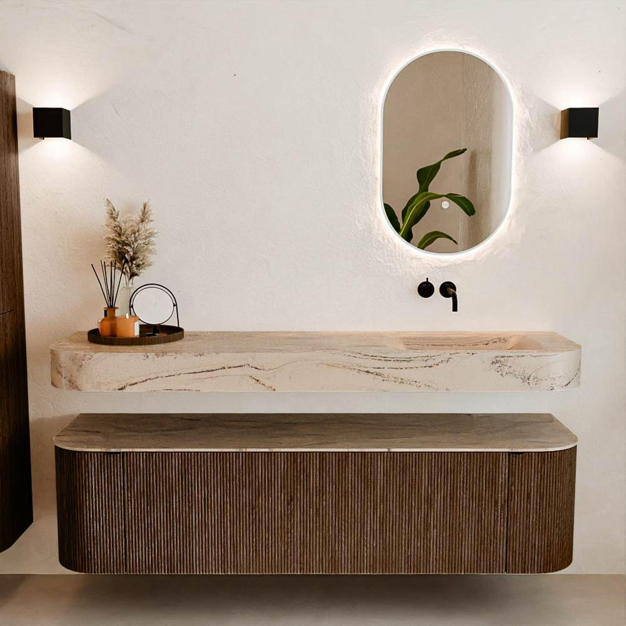 Matériaux naturels aux teintes chaudes. Les cannelures verticales apportent rythme et texture au design, tandis que le chêne confère une apparence chaleureuse et artisanale. Choisissez parmi 5 teintes de bois OAK, WALNUT, DUSK, SHADOW et RUBY, des couleurs de bois soigneusement sélectionnées pour enrichir les salles de bains modernes et classiques.