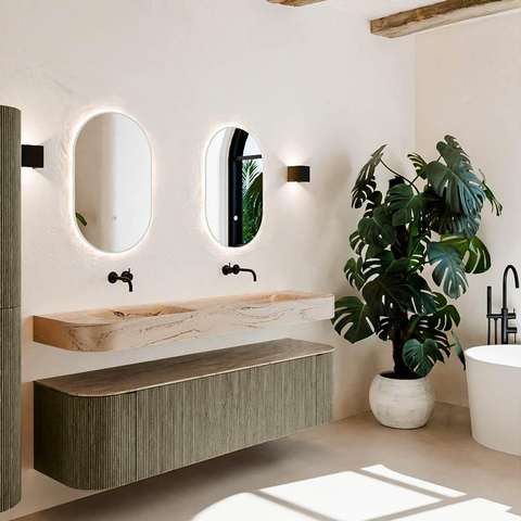 Matériaux naturels dans des tons chauds. Les nervures verticales apportent rythme et texture au design, tandis que le chêne confère une apparence chaleureuse et artisanale. Choisissez parmi 5 teintes de bois OAK, WALNUT, DUSK, SHADOW et RUBY, des couleurs de bois soigneusement sélectionnées pour enrichir les salles de bains modernes et classiques.