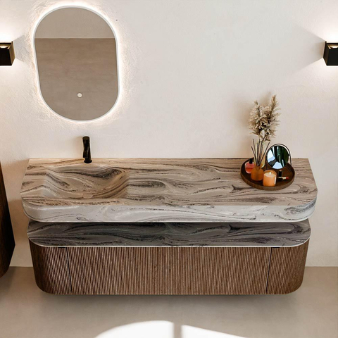 Matériaux naturels dans des tons chauds. Les cannelures verticales apportent rythme et texture au design, tandis que le chêne confère une apparence chaleureuse et artisanale. Choisissez parmi 5 teintes de bois OAK, WALNUT, DUSK, SHADOW et RUBY, des couleurs de bois soigneusement sélectionnées pour enrichir les salles de bains modernes et classiques.