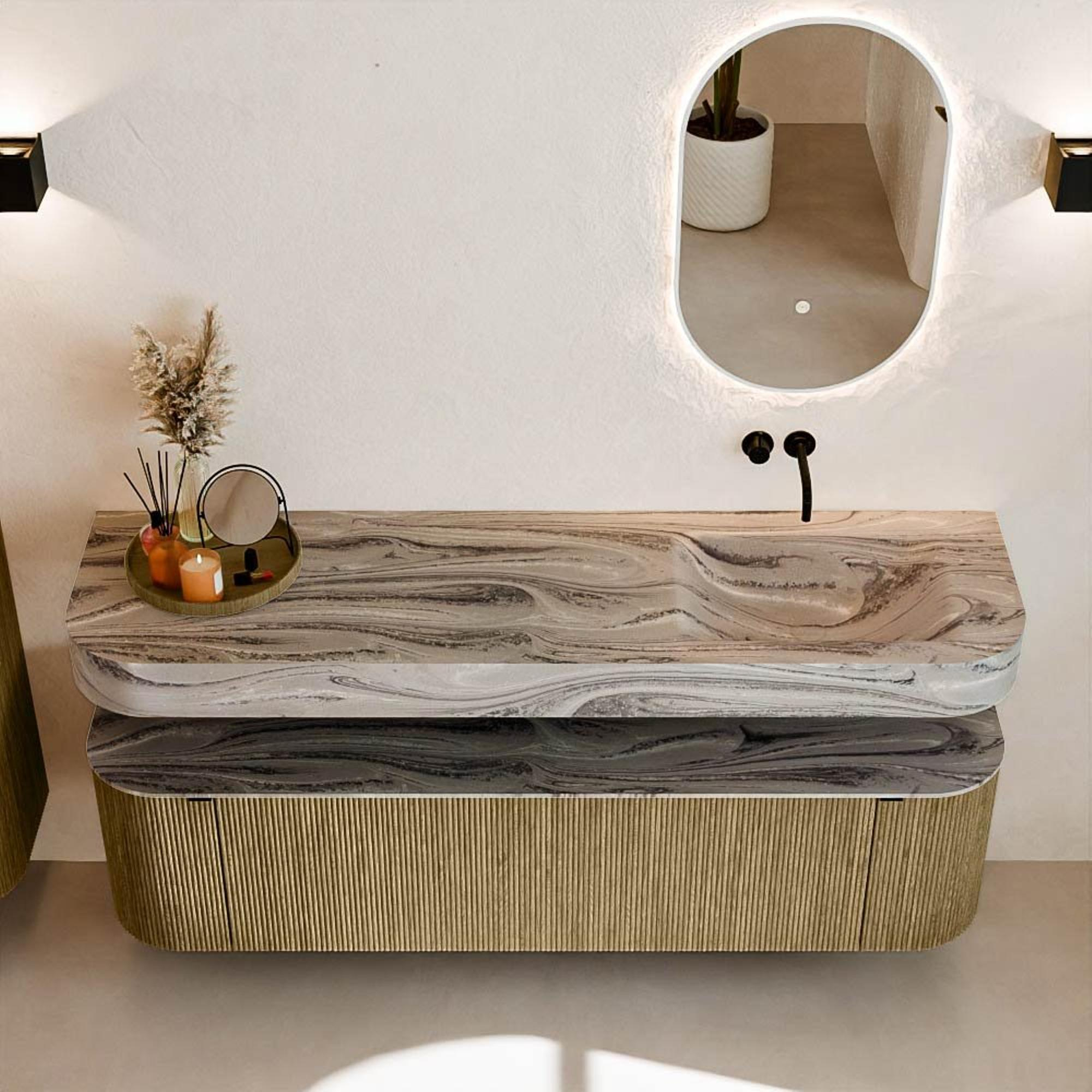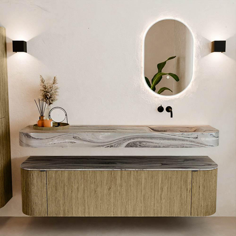 Matériaux naturels dans des tons chauds. Les nervures verticales apportent rythme et texture au design, tandis que le chêne confère une apparence chaleureuse et artisanale. Choisissez parmi 5 teintes de bois OAK, WALNUT, DUSK, SHADOW et RUBY, des couleurs de bois soigneusement sélectionnées pour enrichir les salles de bains modernes et classiques.
