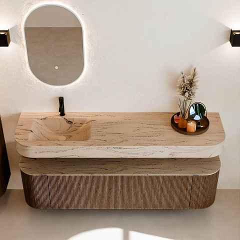Au-dessus du meuble flotte une vasque suspendue assortie aux coins arrondis – parfaitement adaptée à la forme du meuble. La vasque est en Solid Surface et suit subtilement les lignes du meuble inférieur, créant une harmonie parfaite. Le plan de travail en Solid Surface forme une base solide, facile d'entretien et complète la combinaison.