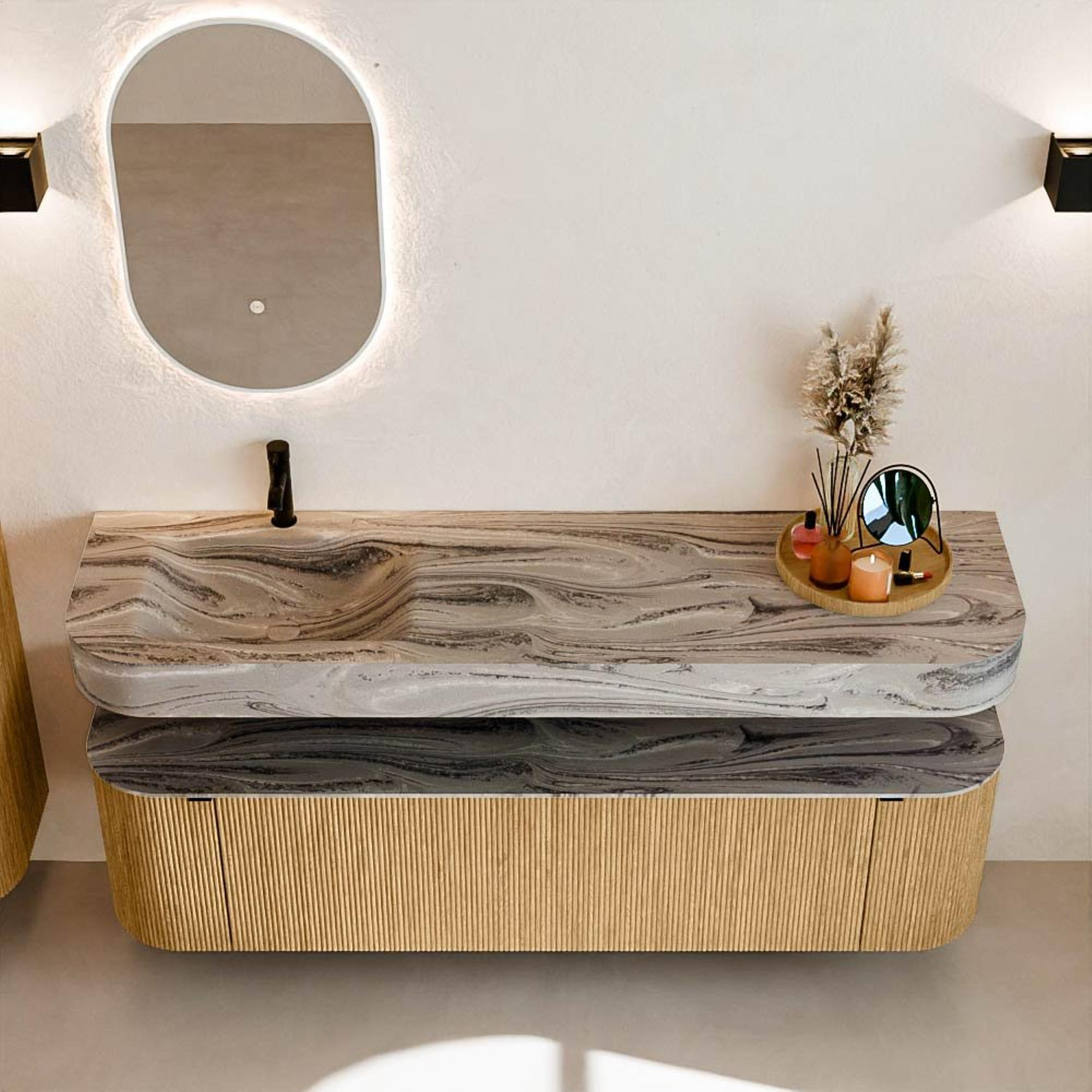 Matériaux naturels dans des tons chauds. Les nervures verticales apportent rythme et texture au design, tandis que le chêne confère une apparence chaleureuse et artisanale. Choisissez parmi 5 teintes de bois OAK, WALNUT, DUSK, SHADOW et RUBY, des couleurs de bois soigneusement sélectionnées pour enrichir les salles de bains modernes et classiques.
