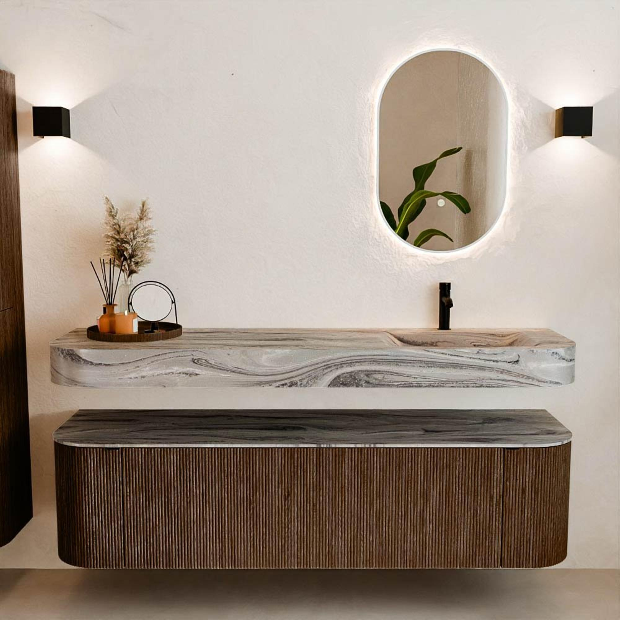 Matériaux naturels dans des tons chauds. Les cannelures verticales apportent rythme et texture au design, tandis que le chêne confère une apparence chaleureuse et artisanale. Choisissez parmi 5 teintes de bois OAK, WALNUT, DUSK, SHADOW et RUBY, des couleurs de bois soigneusement sélectionnées pour enrichir les salles de bains modernes et classiques.