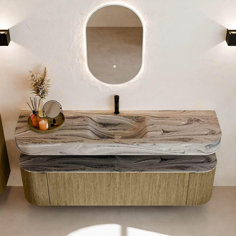 Matériaux naturels dans des tons chauds. Les nervures verticales apportent rythme et texture au design, tandis que le chêne confère une apparence chaleureuse et artisanale. Choisissez parmi 5 teintes de bois OAK, WALNUT, DUSK, SHADOW et RUBY, des couleurs de bois soigneusement sélectionnées pour enrichir les salles de bains modernes et classiques.