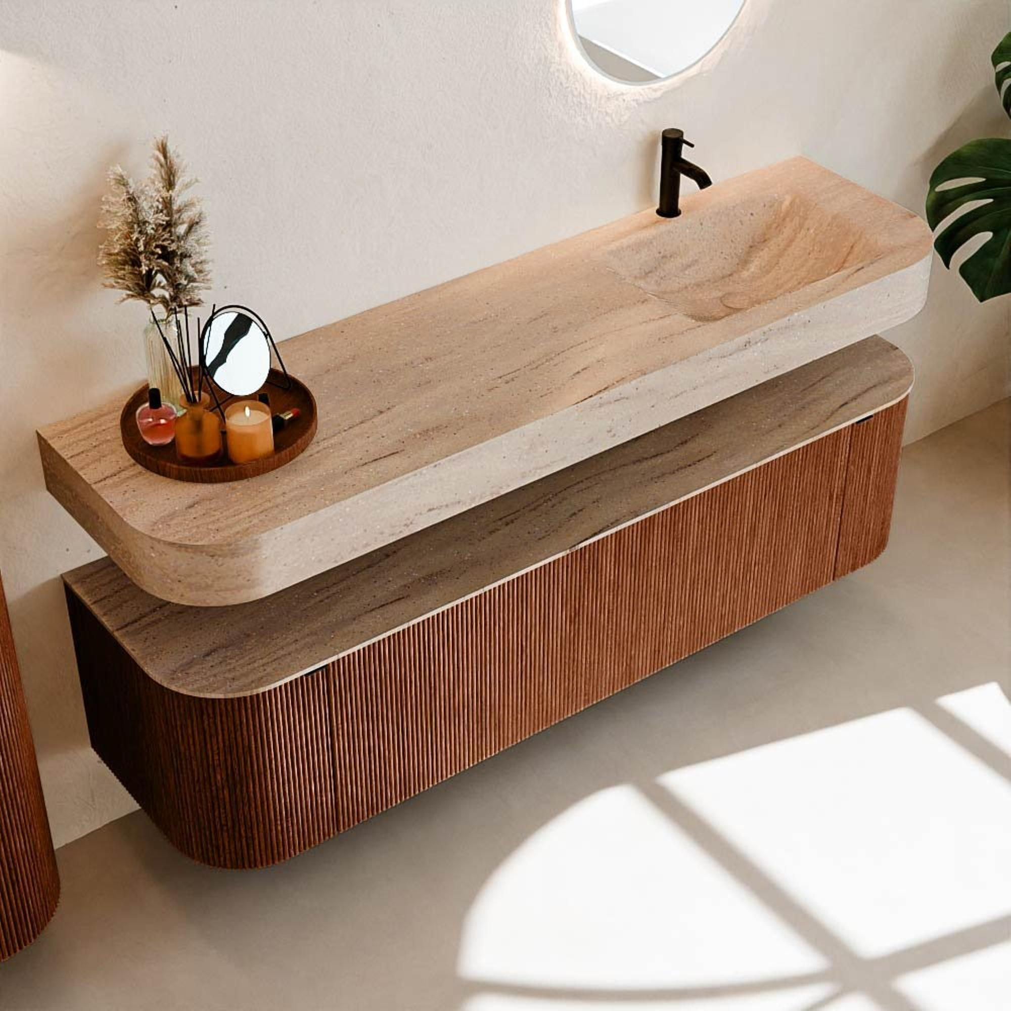 Au-dessus du meuble flotte une vasque suspendue assortie avec des coins arrondis – parfaitement adaptée à la forme du meuble. La vasque est réalisée en Solid Surface et suit subtilement les lignes du meuble inférieur, créant ainsi un ensemble harmonieux. Le plan de travail en Solid Surface forme une base solide, facile d'entretien, et complète la combinaison.