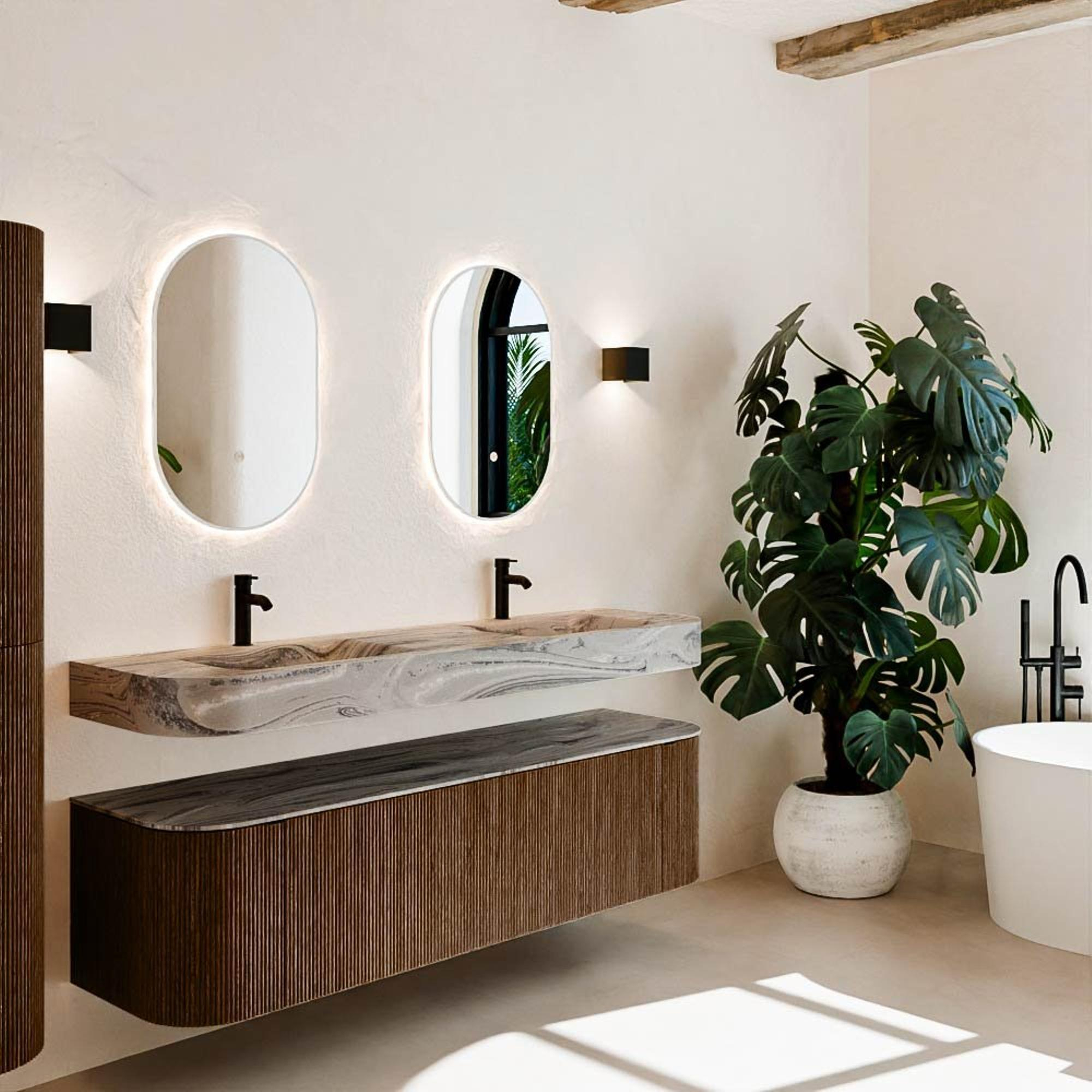 Matériaux naturels dans des tons chauds. Les nervures verticales apportent rythme et texture au design, tandis que le chêne confère une apparence chaleureuse et artisanale. Choisissez parmi 5 teintes de bois OAK, WALNUT, DUSK, SHADOW et RUBY, des couleurs de bois soigneusement sélectionnées pour enrichir les salles de bains modernes et classiques.