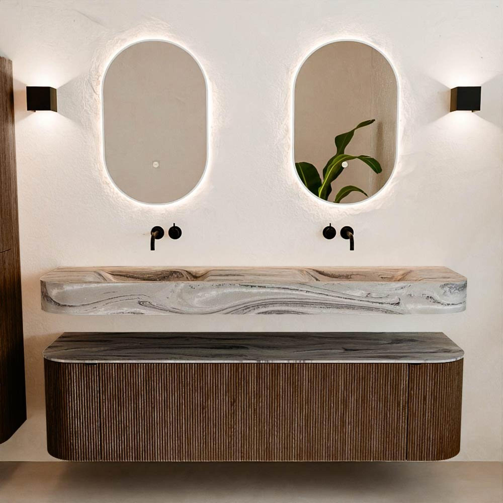 MONDIAZ THOR-DLUX 170cm meuble de salle de bains arrondi gauche + droite couleur Walnut avec 1 tiroir et 2 portes. Vasque suspendue CLOUD Double sans trou de robinet couleur Sombra.