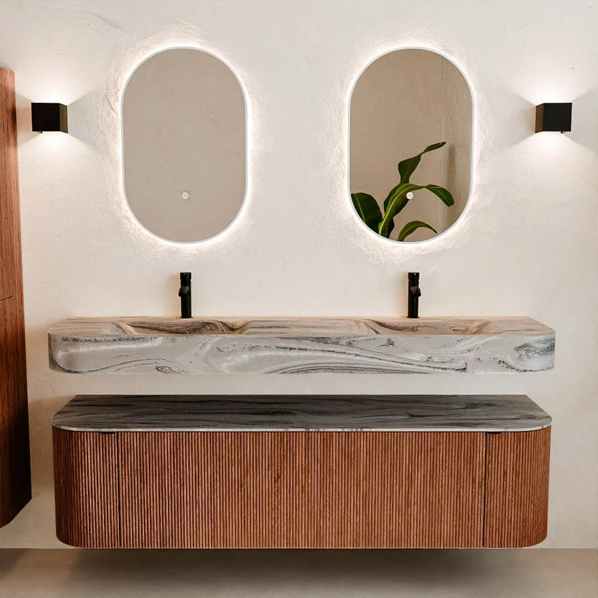 Matériaux naturels dans des tons chauds. Les rainures verticales apportent rythme et texture au design, tandis que le chêne confère une apparence chaleureuse et artisanale. Choisissez parmi 5 teintes de bois OAK, WALNUT, DUSK, SHADOW et RUBY, des couleurs de bois soigneusement sélectionnées pour enrichir les salles de bains modernes et classiques.
