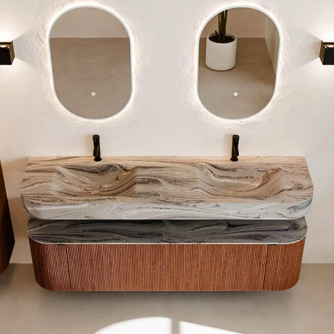 MONDIAZ THOR-DLUX Meuble de salle de bains 170cm arrondi gauche + droite couleur Ruby avec 1 tiroir et 2 portes. Vasque suspendue CLOUD Double 2 trous de robinet couleur Sombra.