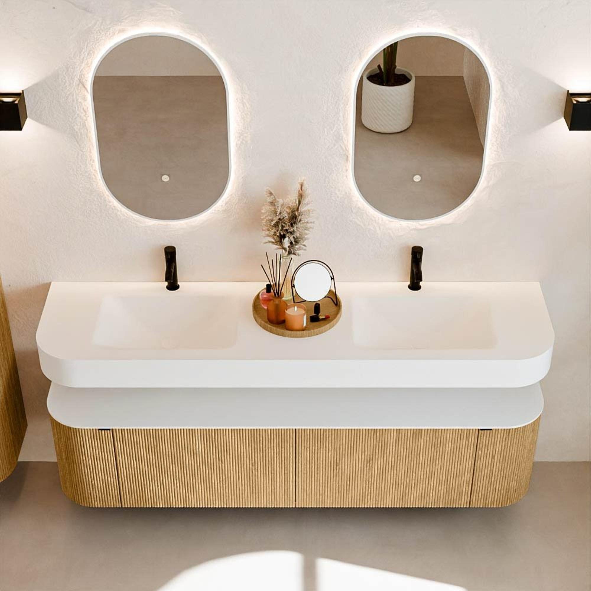 Au-dessus du meuble flotte une vasque suspendue assortie aux coins arrondis – parfaitement adaptée à la forme du meuble. La vasque est en Solid Surface et suit subtilement les lignes du meuble inférieur, créant ainsi un ensemble harmonieux. Le plan de travail en Solid Surface forme une base solide, facile d'entretien, complétant la combinaison.