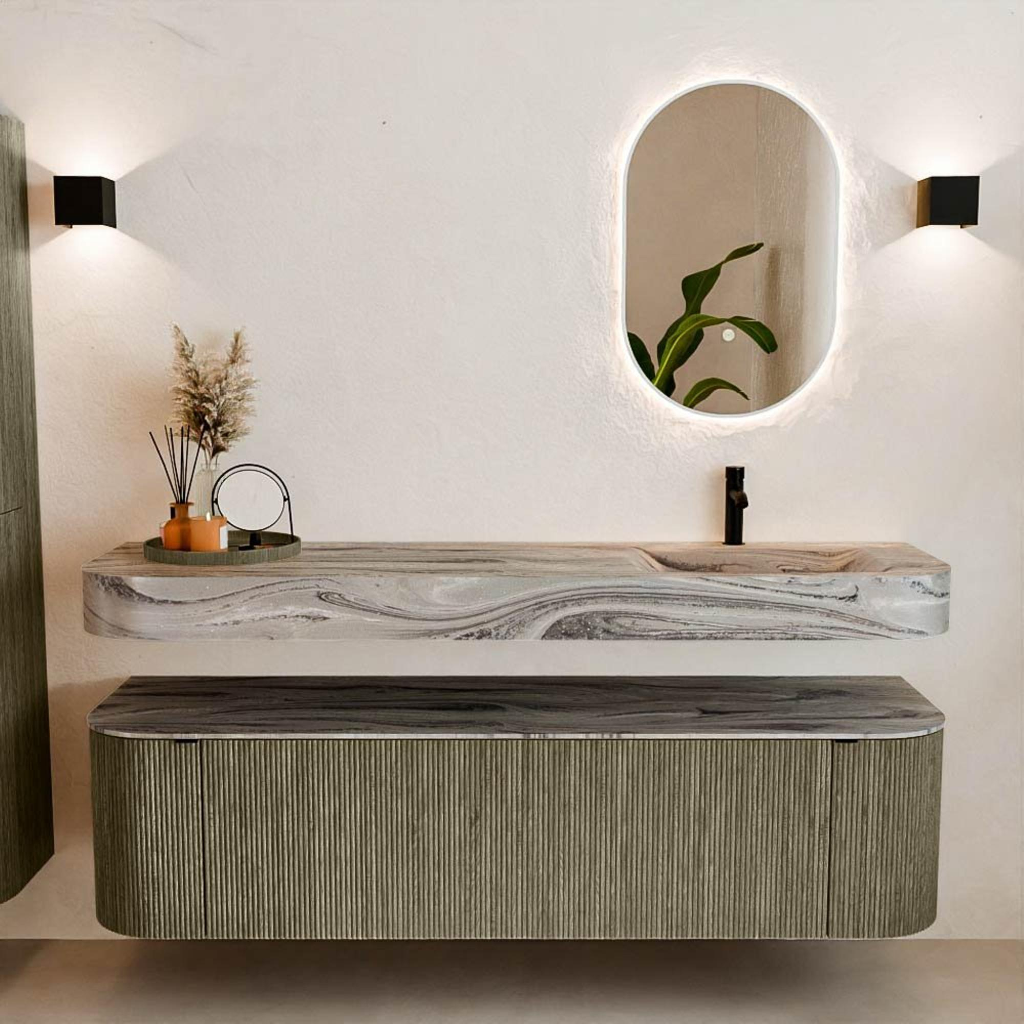 Matériaux naturels dans des tons chauds. Les nervures verticales apportent rythme et texture au design, tandis que le chêne confère une apparence chaleureuse et artisanale. Choisissez parmi 5 teintes de bois OAK, WALNUT, DUSK, SHADOW et RUBY, des couleurs de bois soigneusement sélectionnées pour enrichir les salles de bains modernes et classiques.