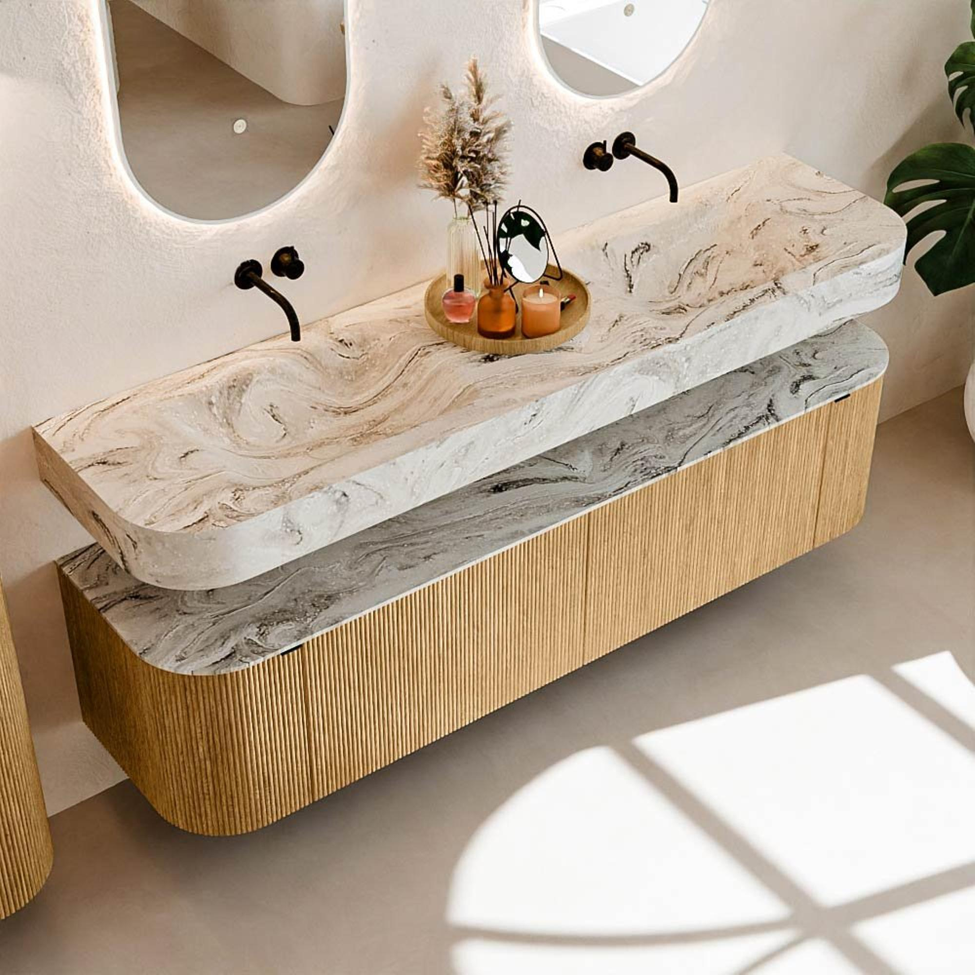 MONDIAZ THOR-DLUX 180cm meuble de salle de bains arrondi gauche + droite couleur Oak avec 2 tiroirs et 2 portes. Vasque suspendue CLOUD Double sans trou de robinet couleur Glace.