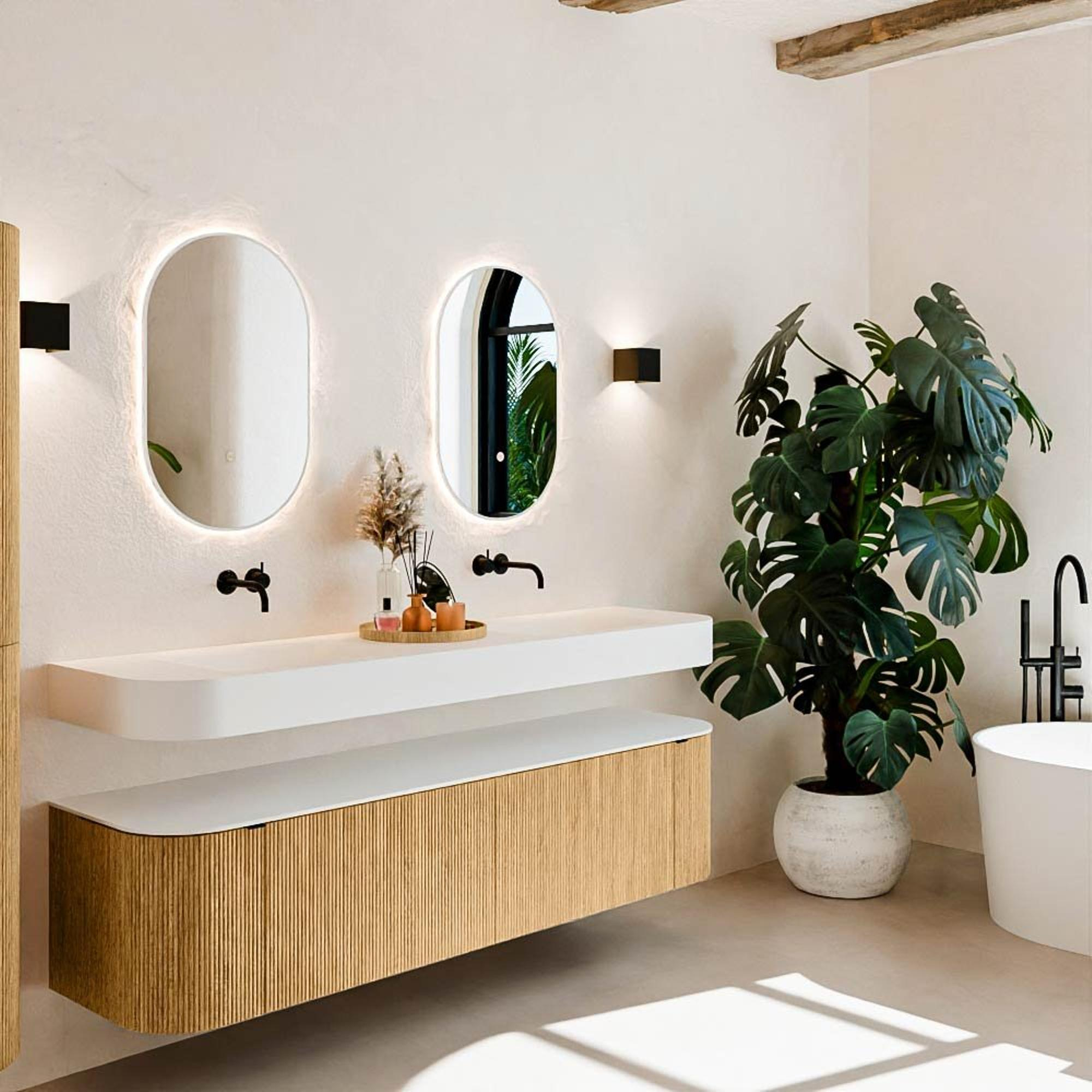 Matériaux naturels dans des tons chauds. Les nervures verticales apportent rythme et texture au design, tandis que le chêne confère une apparence chaleureuse et artisanale. Choisissez parmi 5 teintes de bois OAK, WALNUT, DUSK, SHADOW et RUBY, des couleurs de bois soigneusement sélectionnées pour enrichir les salles de bains modernes et classiques.